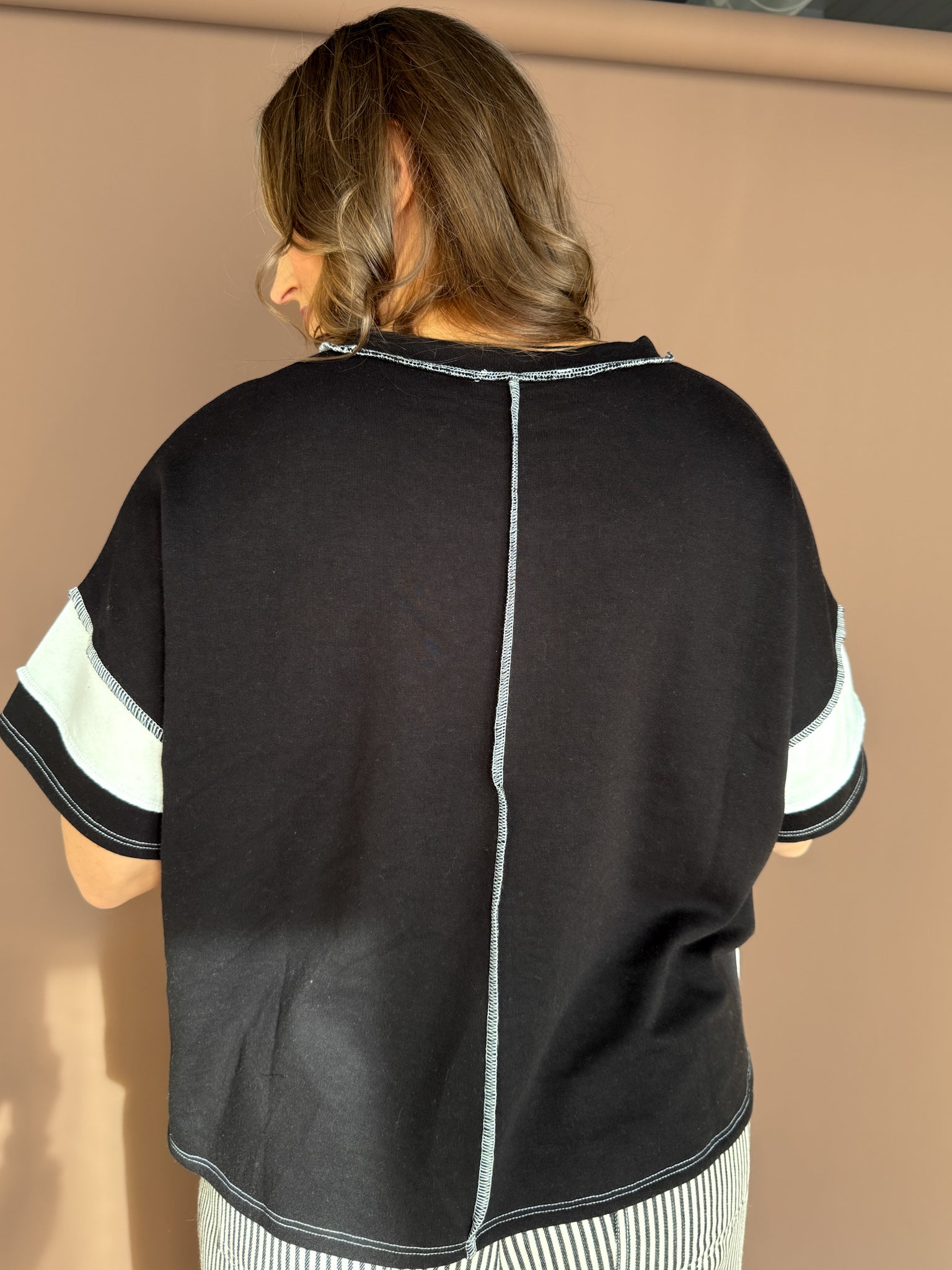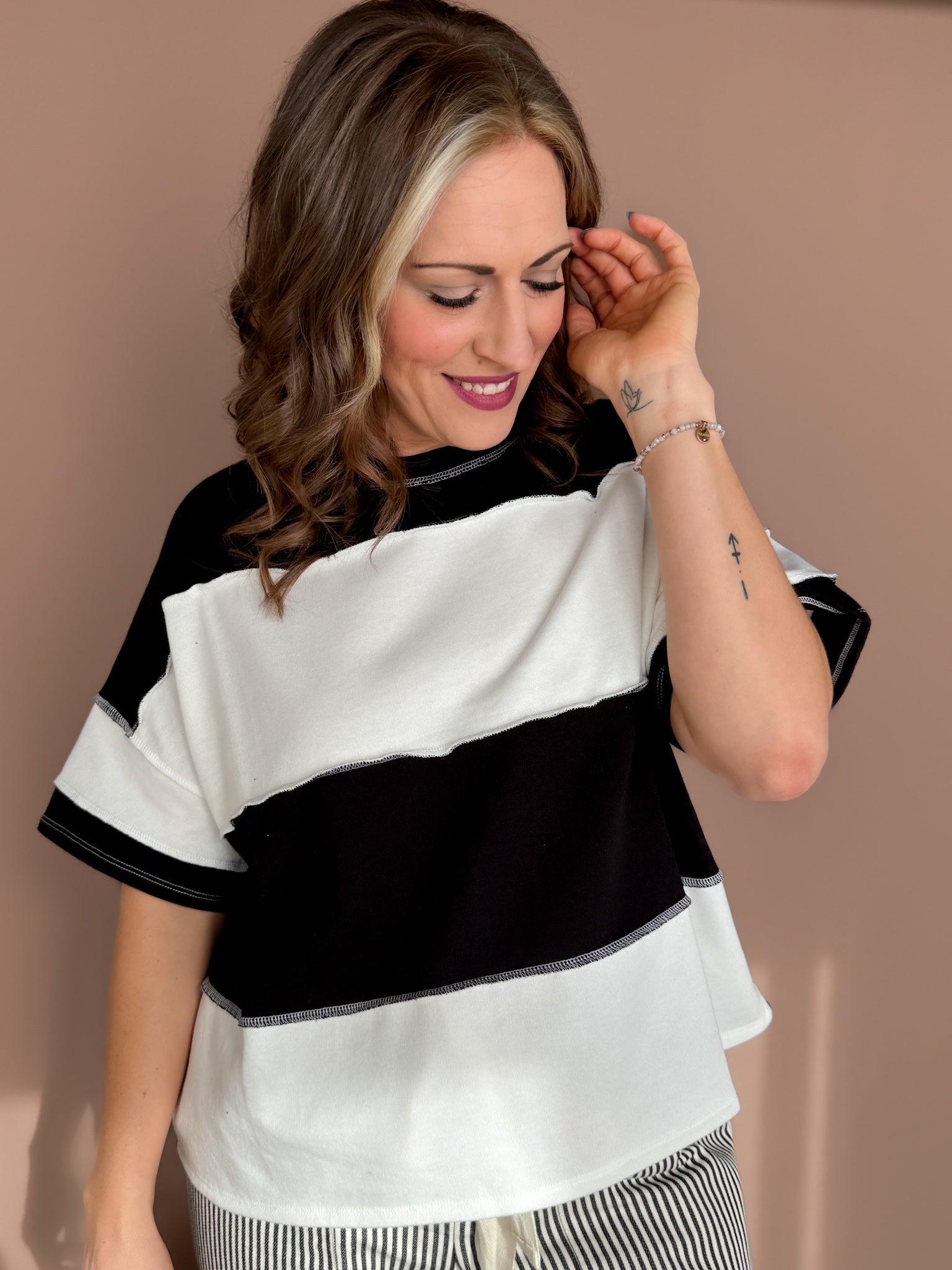 Lightweight, casual, and full of personality—this colorblock tee is an effortless everyday top. Easy to wear, easy to style, and ideal for everything from errands to coffee runs.