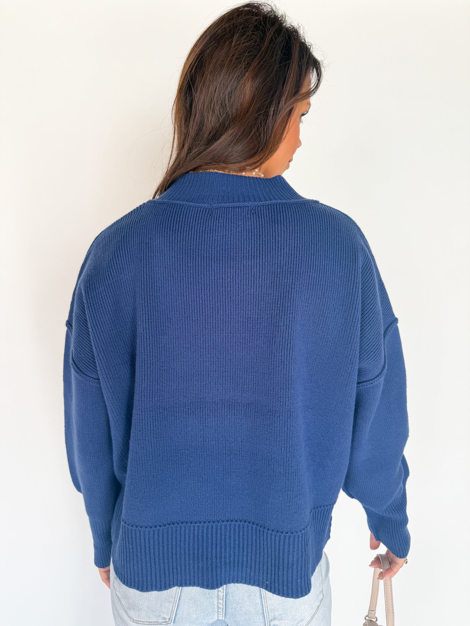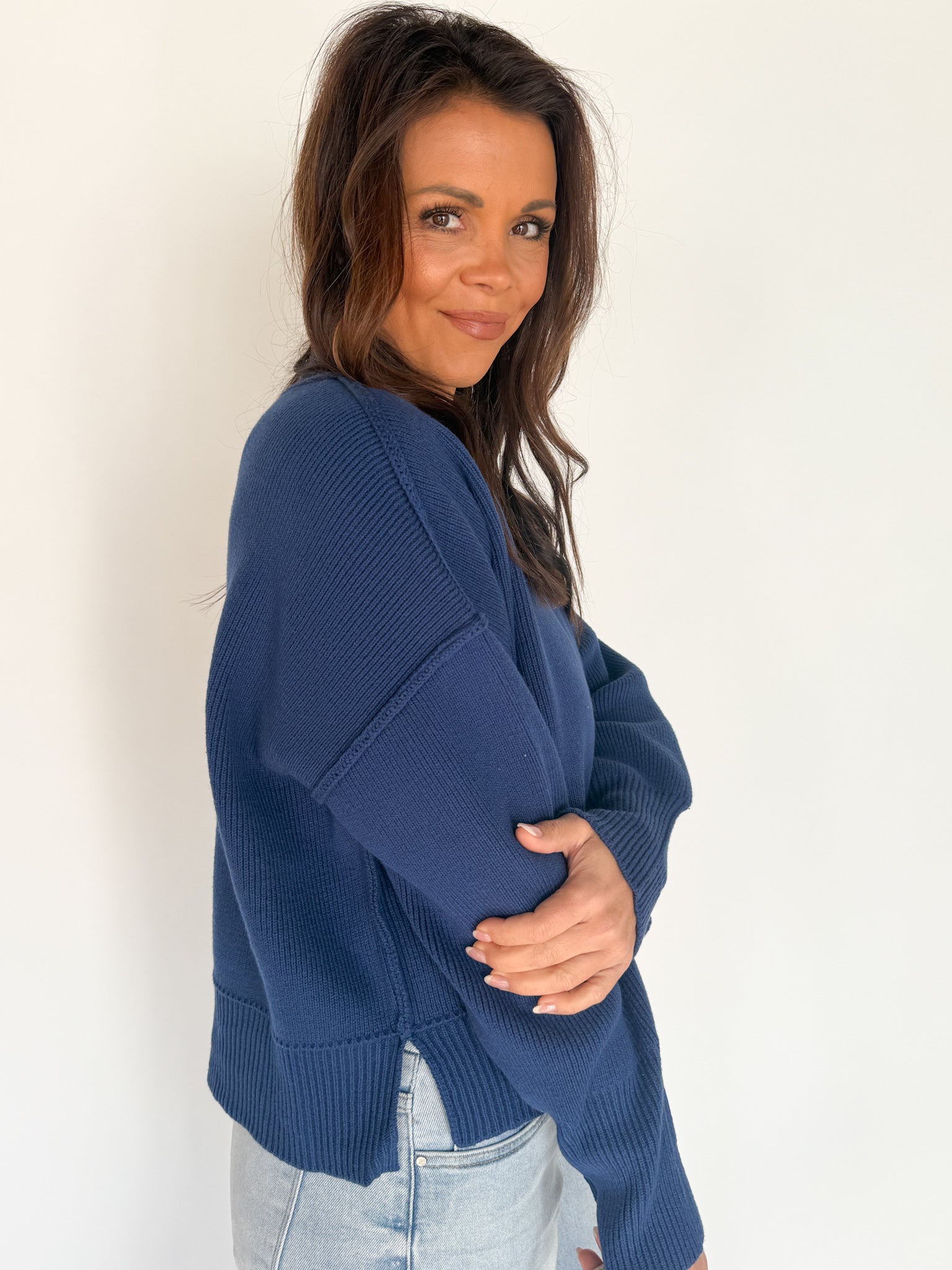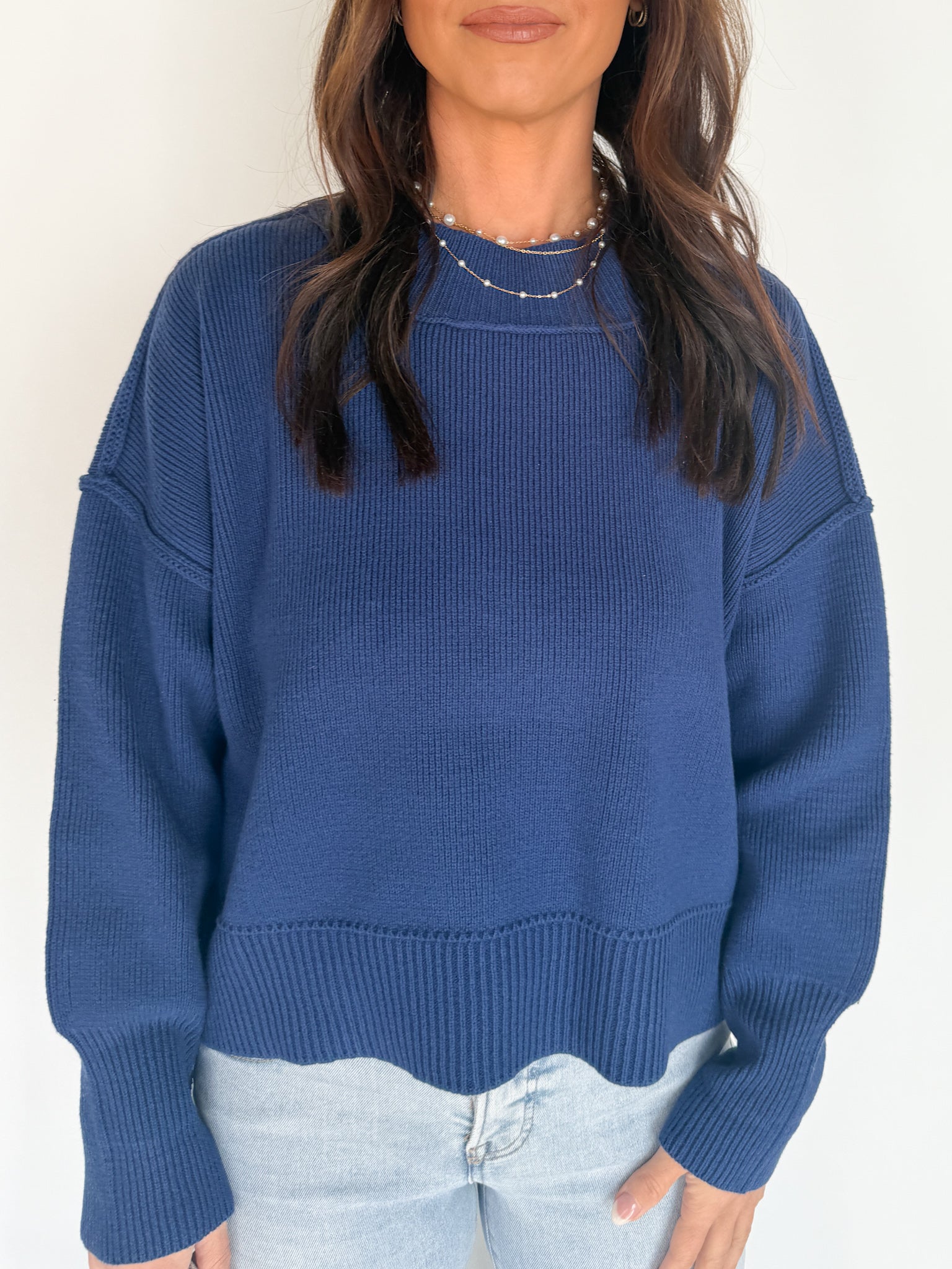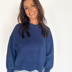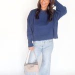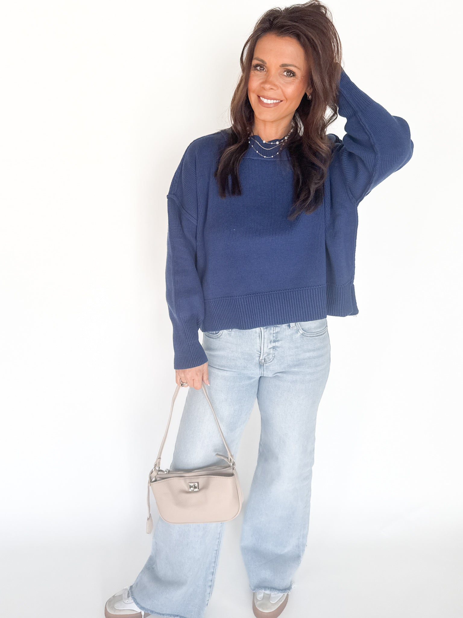 Simple, flattering, and easy to style—this navy mom crop sweater is the perfect throw-on piece. Fun to accessorize and effortless with jeans, it’s a go-to for just about every occasion.