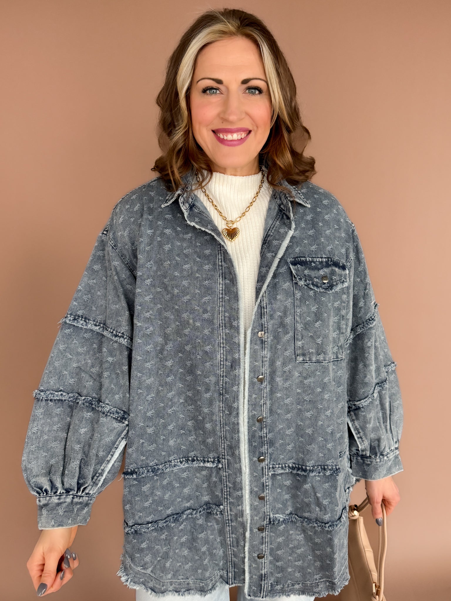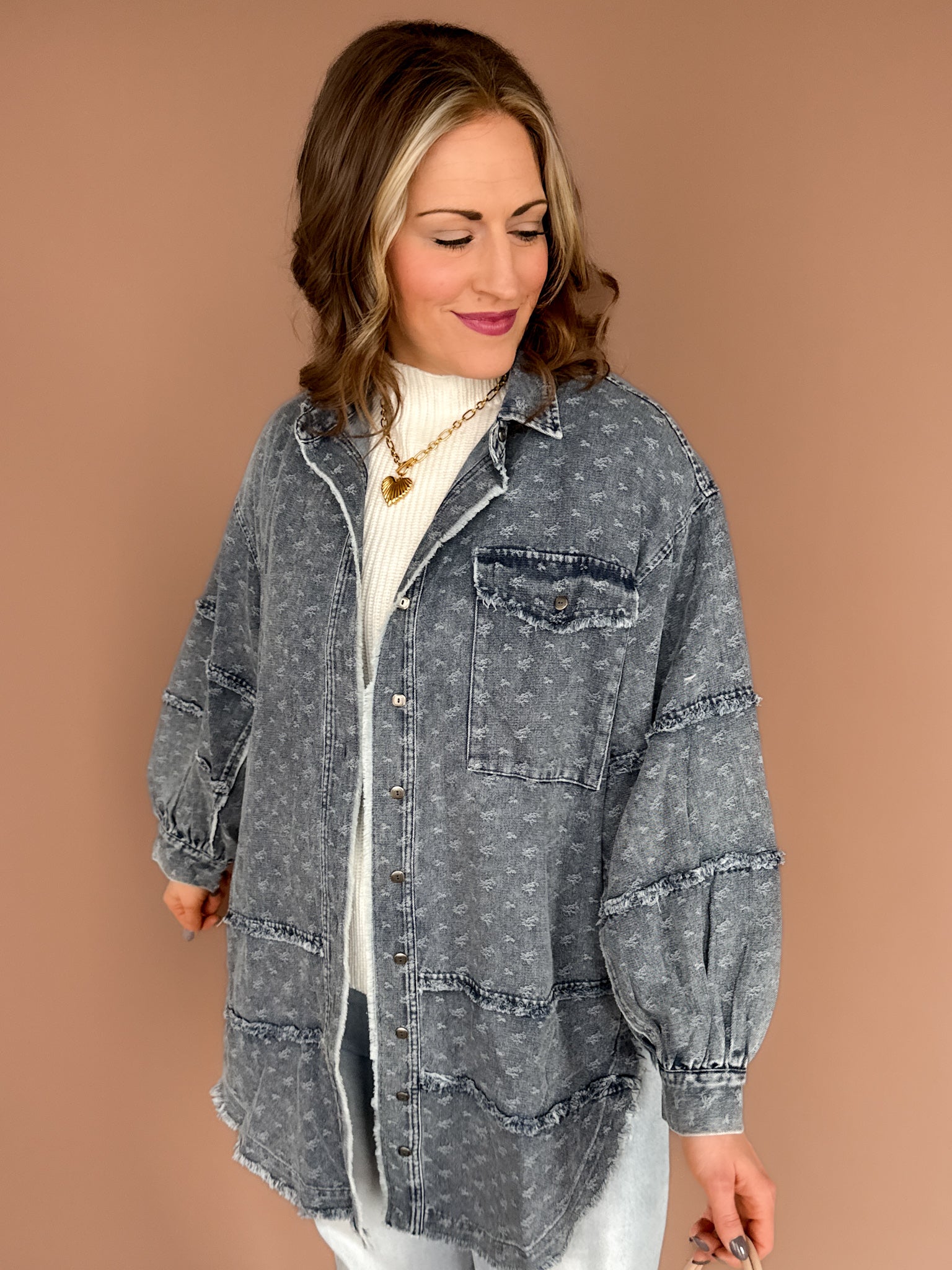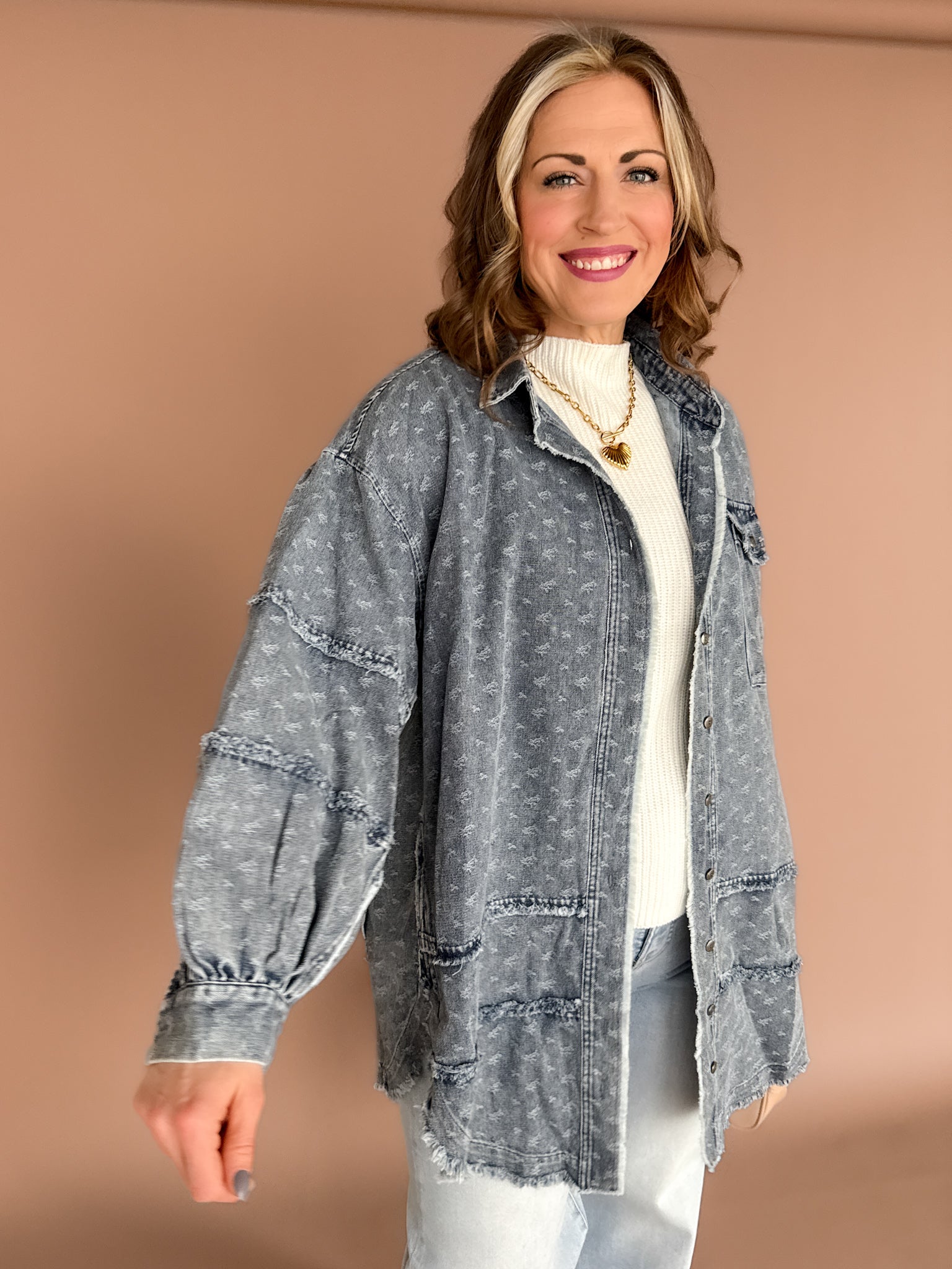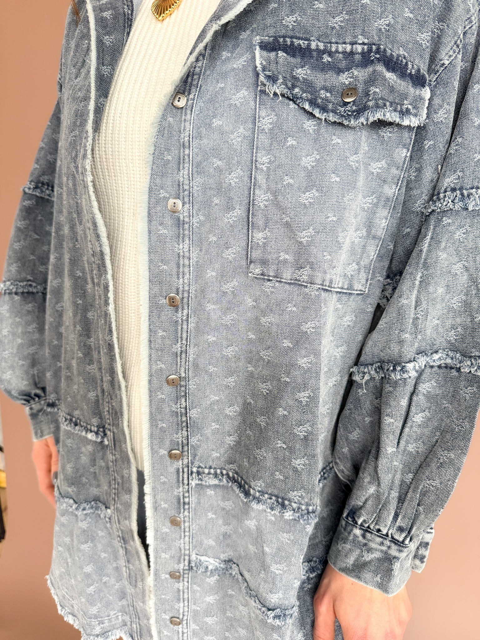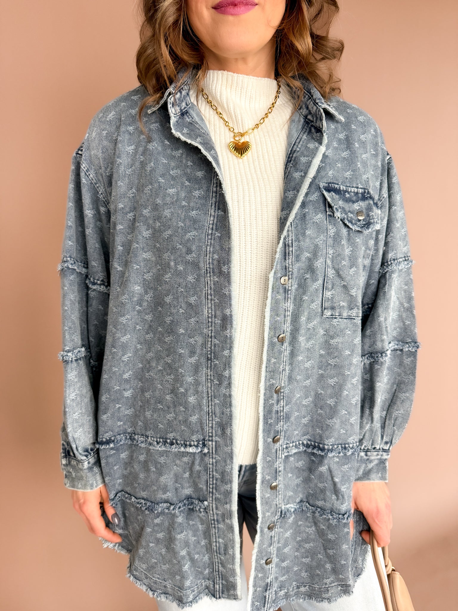Your new wear-it-on-repeat layer. This oversized denim button-up is sprinkled with mini floral embroidery and finished with a raw hem for that perfectly relaxed feel. Easy to layer, effortless to style, and the kind of piece you’ll grab all year long—no matter the season