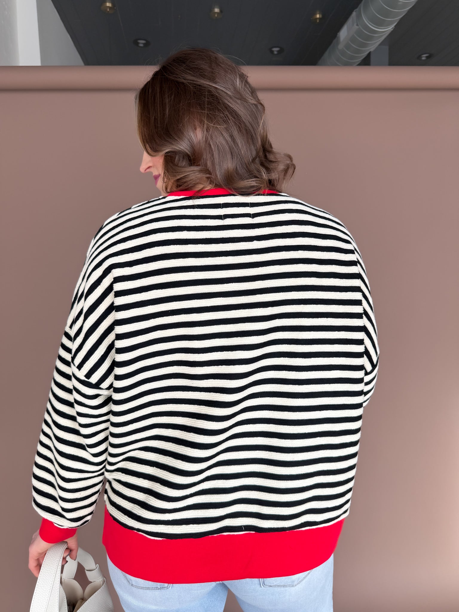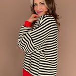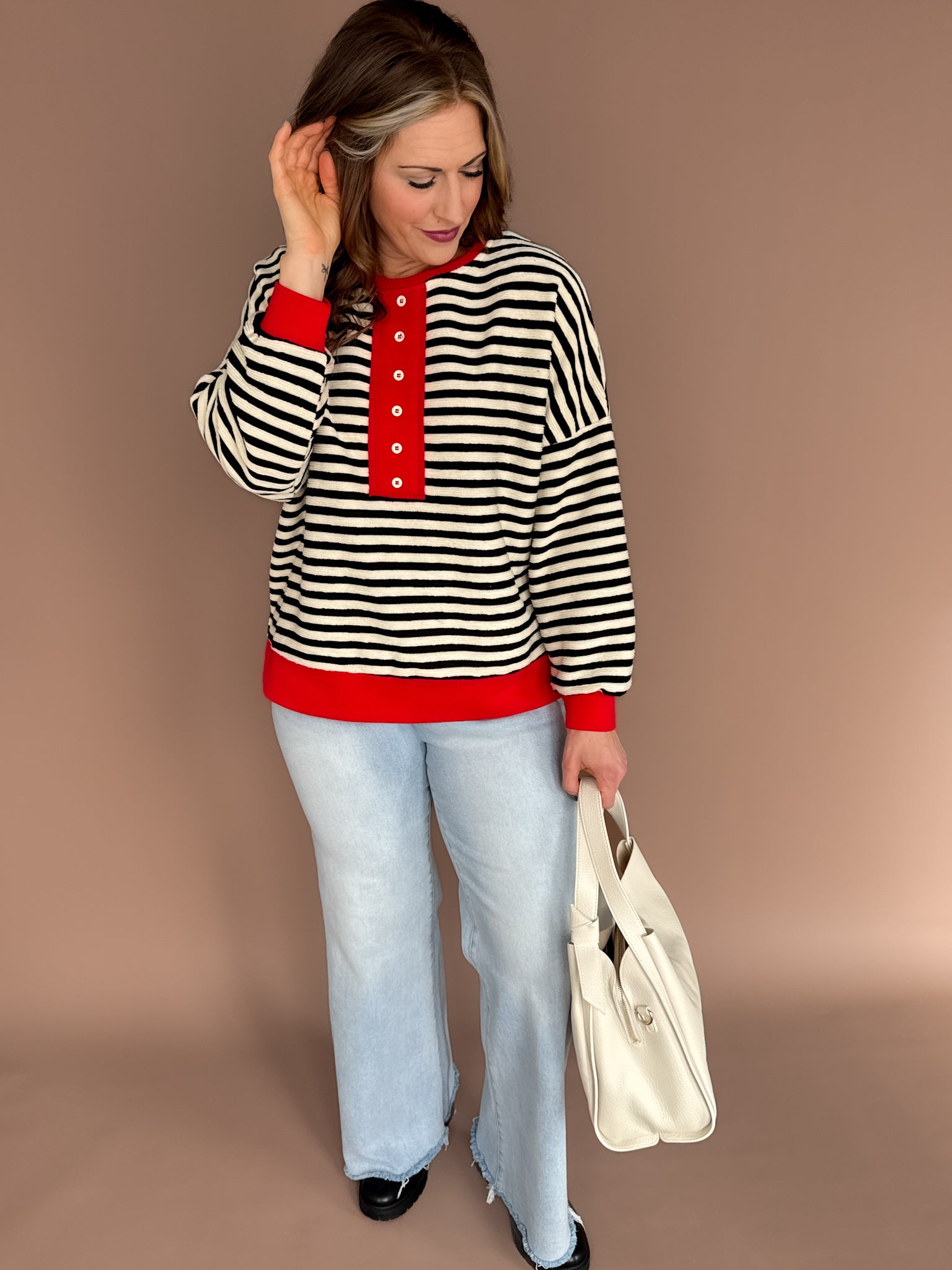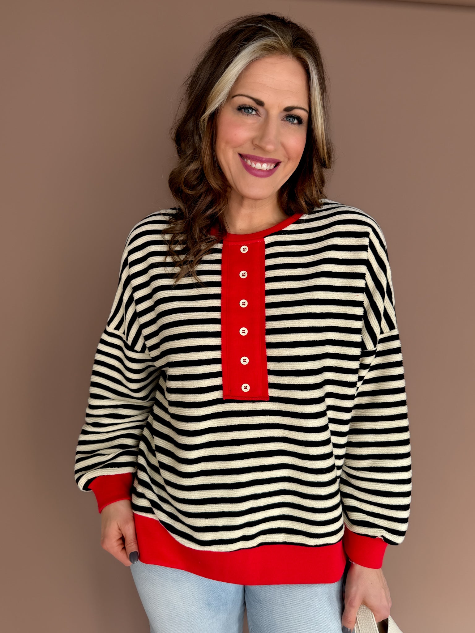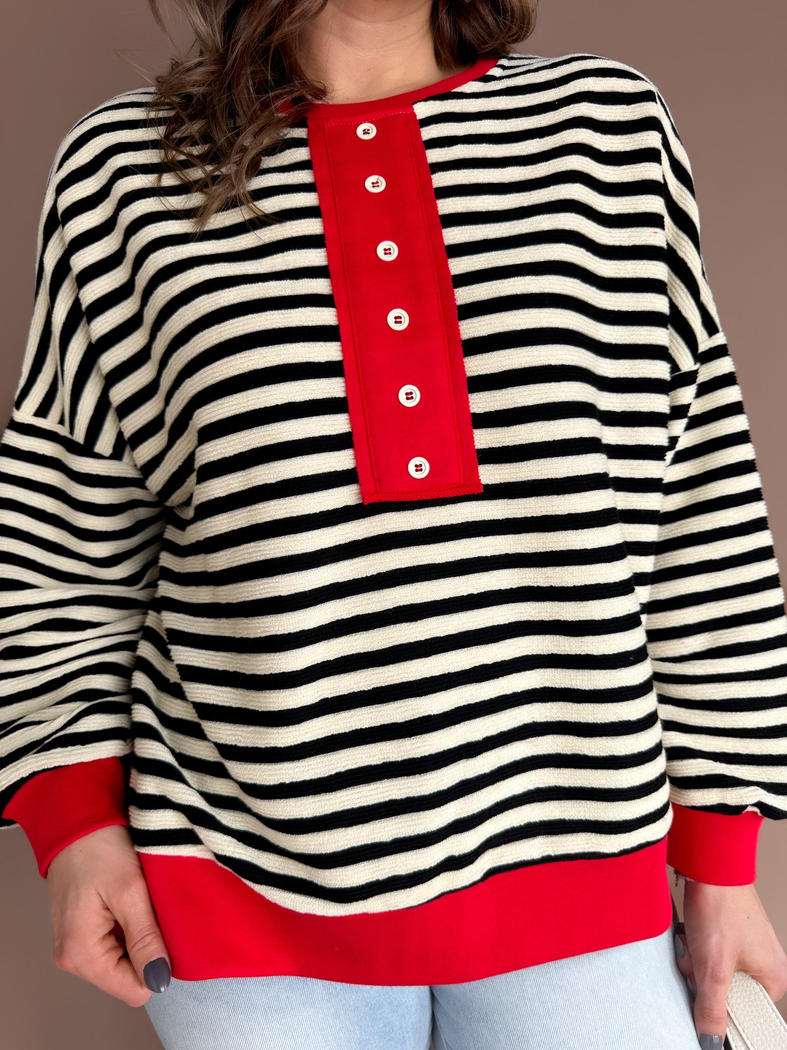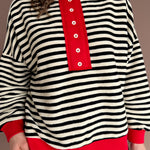 This black and white striped henley top is the perfect mix of classic and playful. Featuring faux buttons and a fun pop of red contrasting trim, it adds just the right amount of personality to an everyday staple. Lightweight and ultra-comfy, it’s easy to dress up with denim and accessories or keep casual for laid-back days. A versatile go-to that makes getting dressed feel effortless while still feeling a little special.