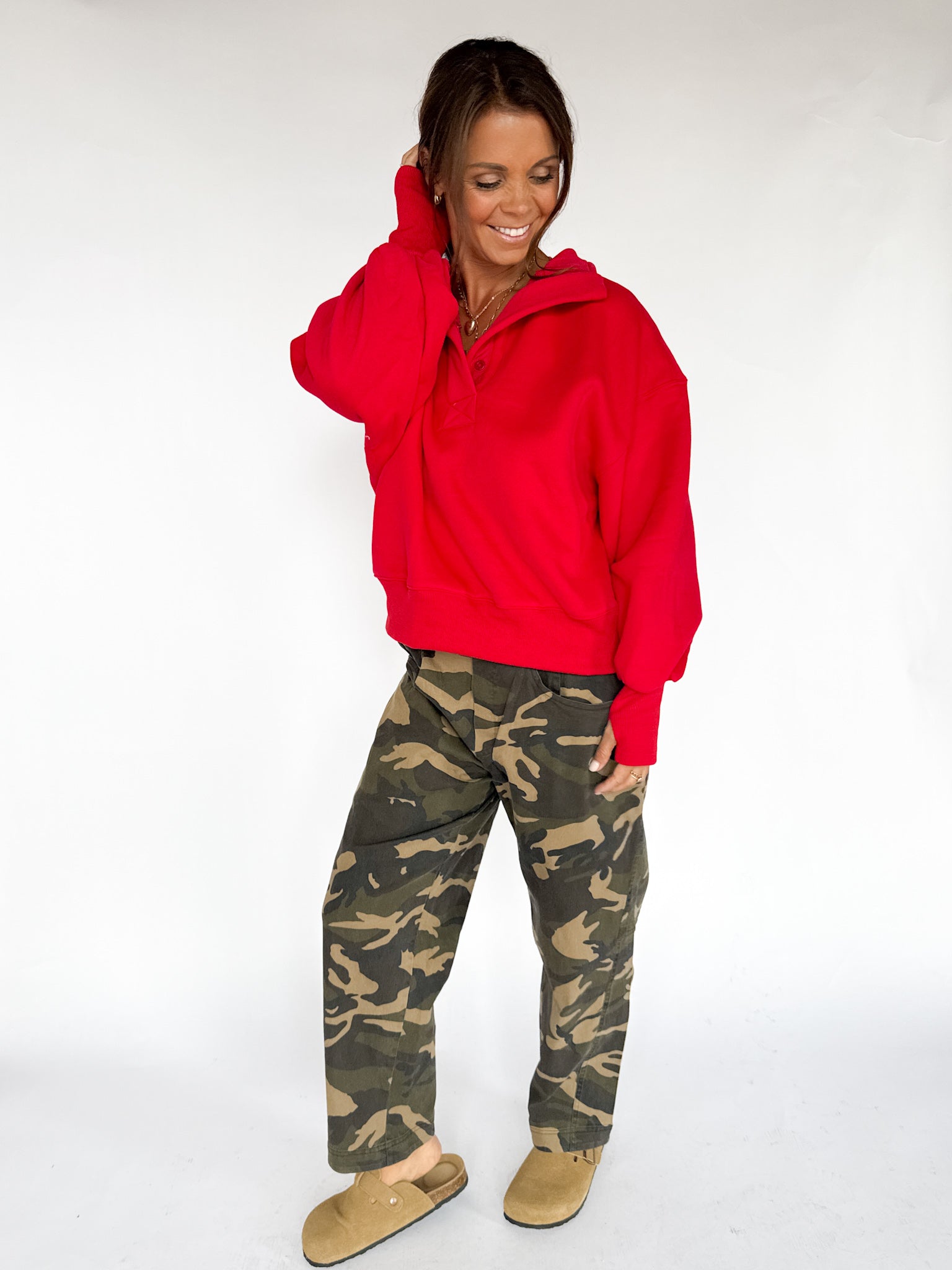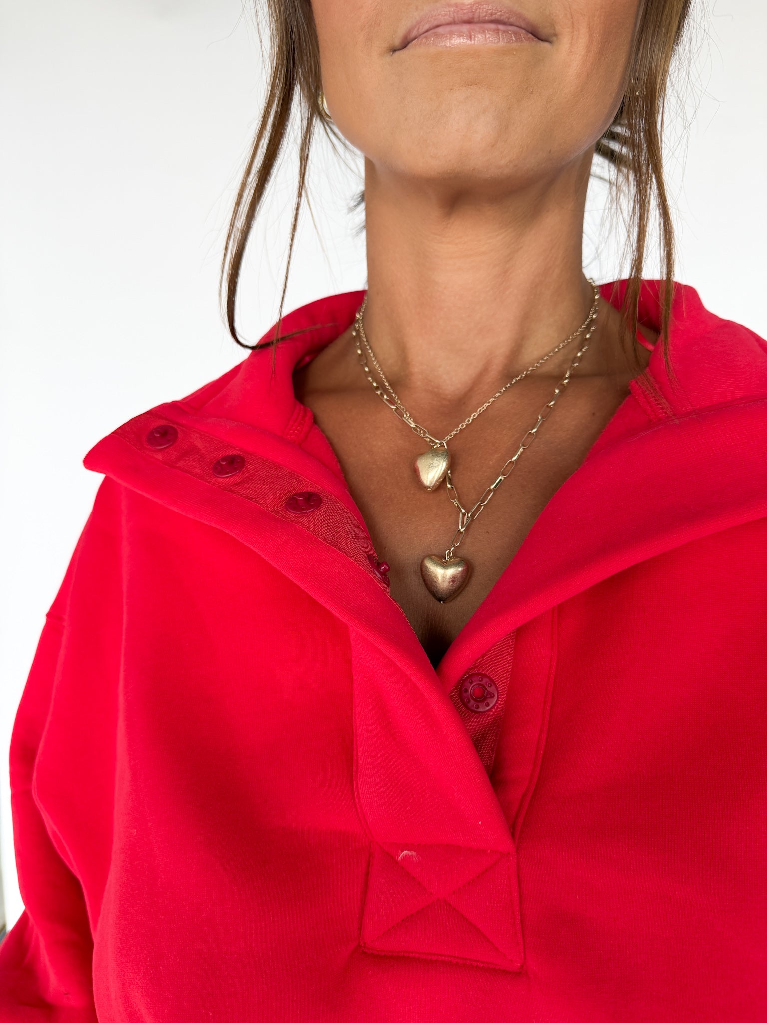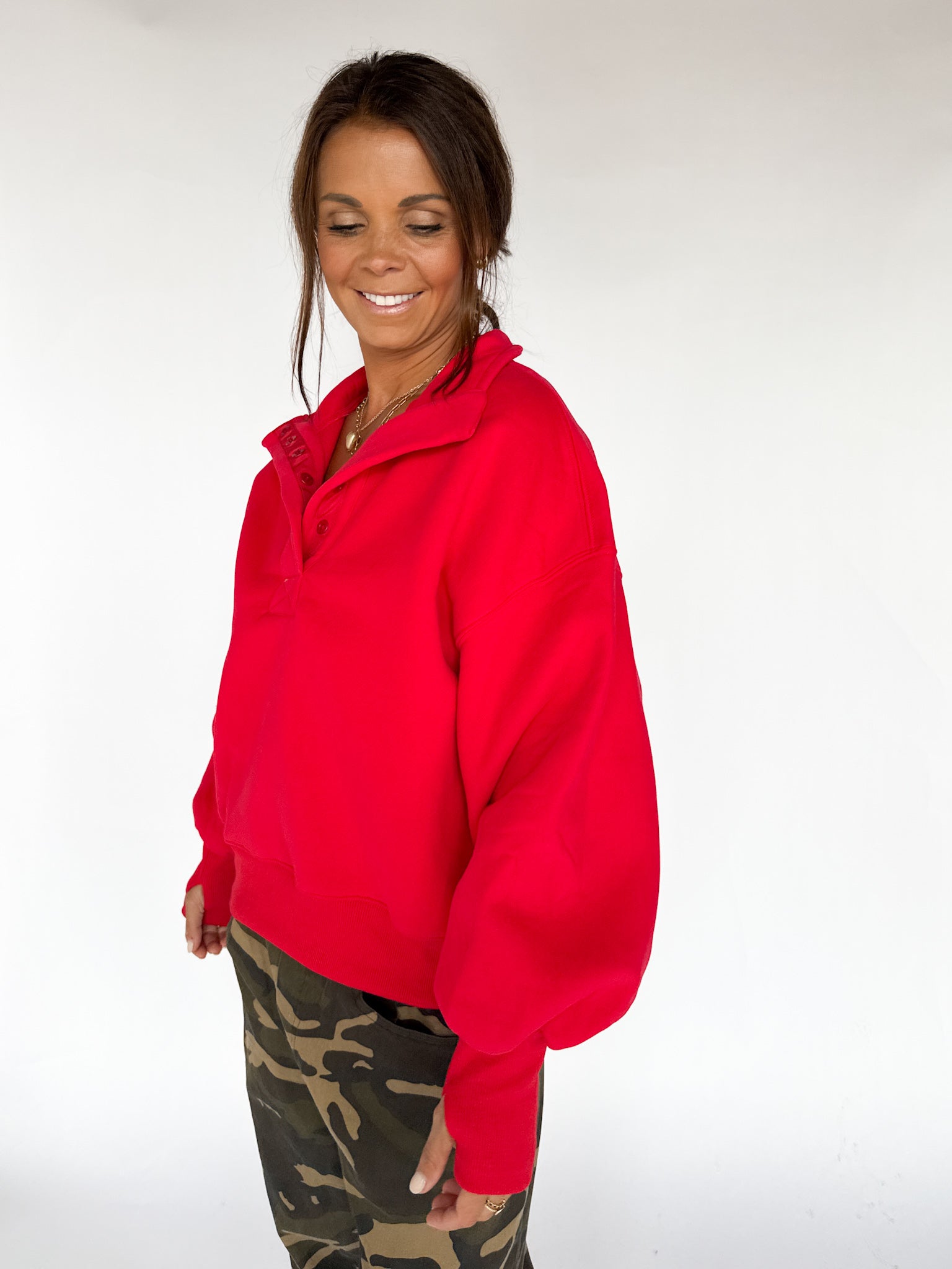 Your new lounge-day favorite. This fleece pullover combines soft, snuggly comfort with playful details — think fun 3/4 snaps and a unique split cuff that set it apart from the usual. Perfect for days when lounging is at the top of your to-do list but you still want to look put-together. Pair with leggings or joggers for an easy, go-anywhere outfit that feels like a hug.