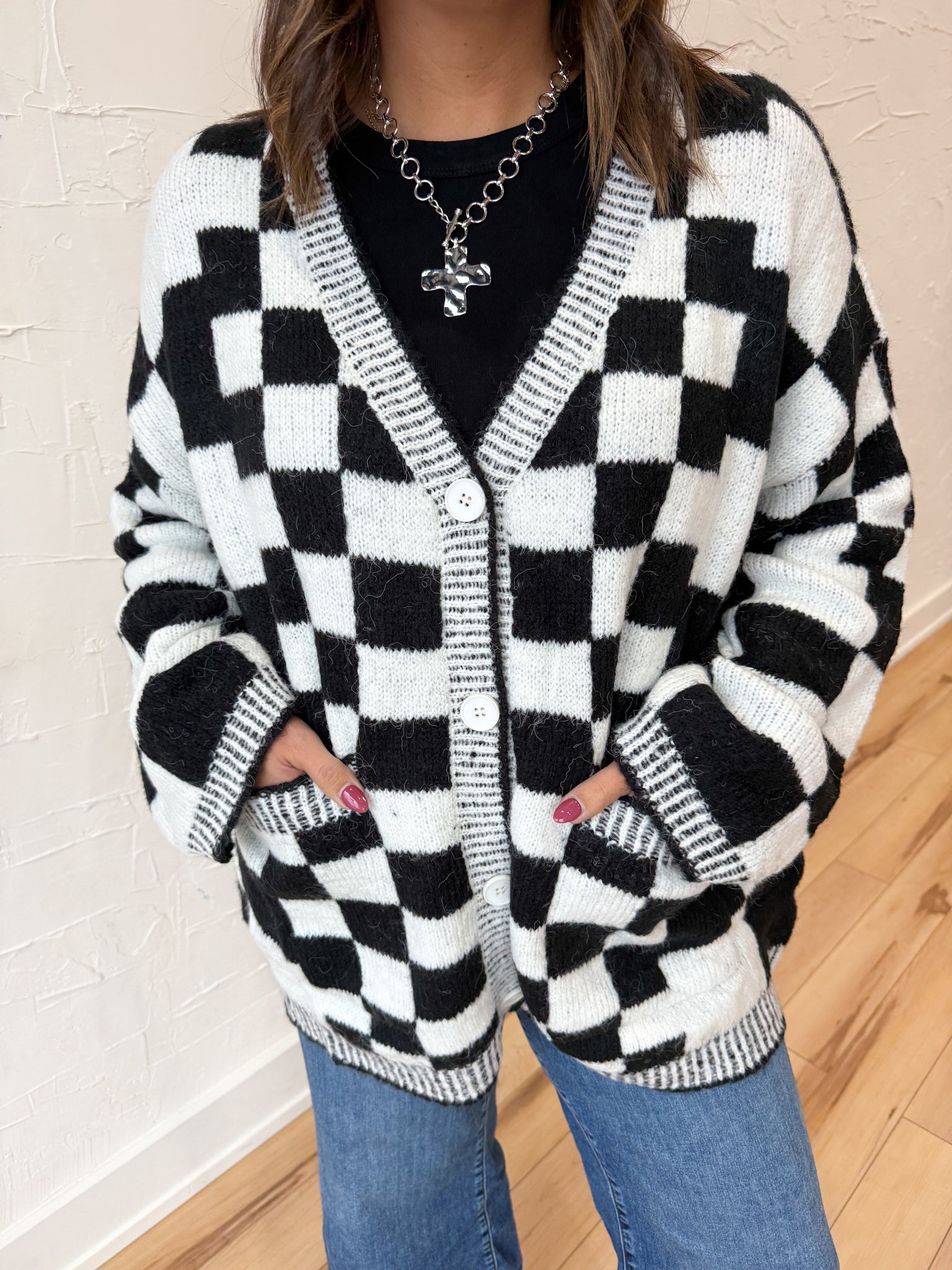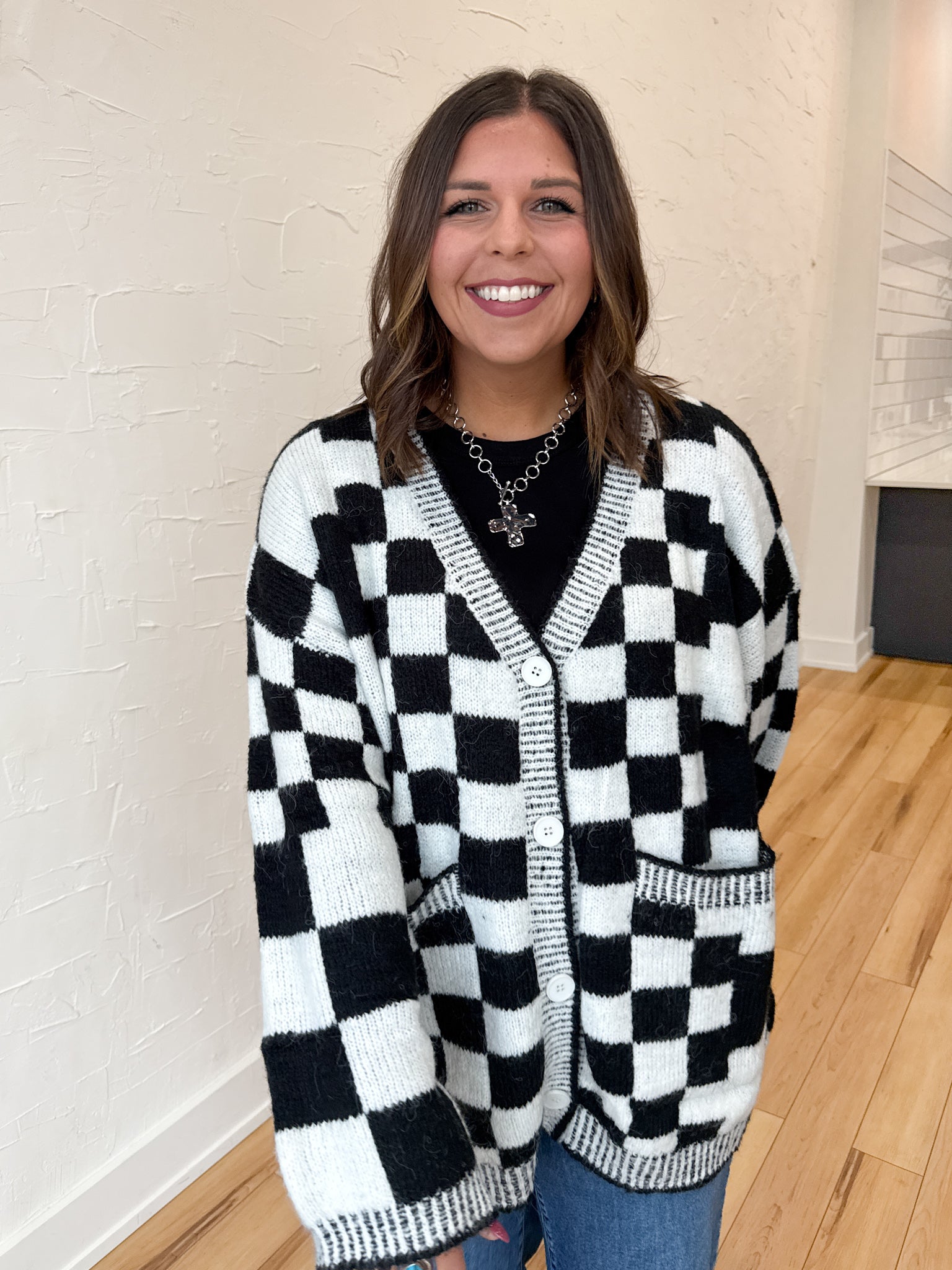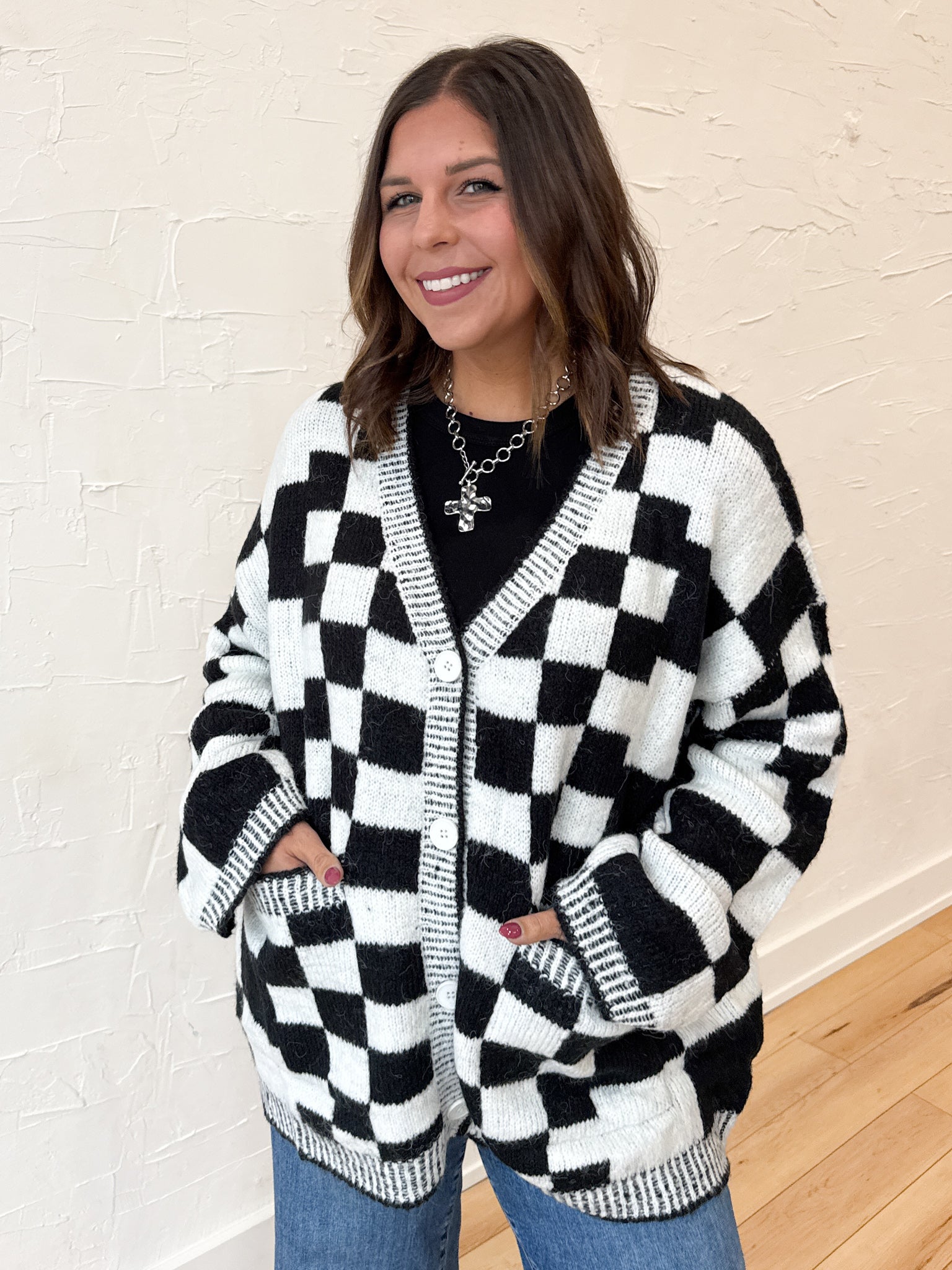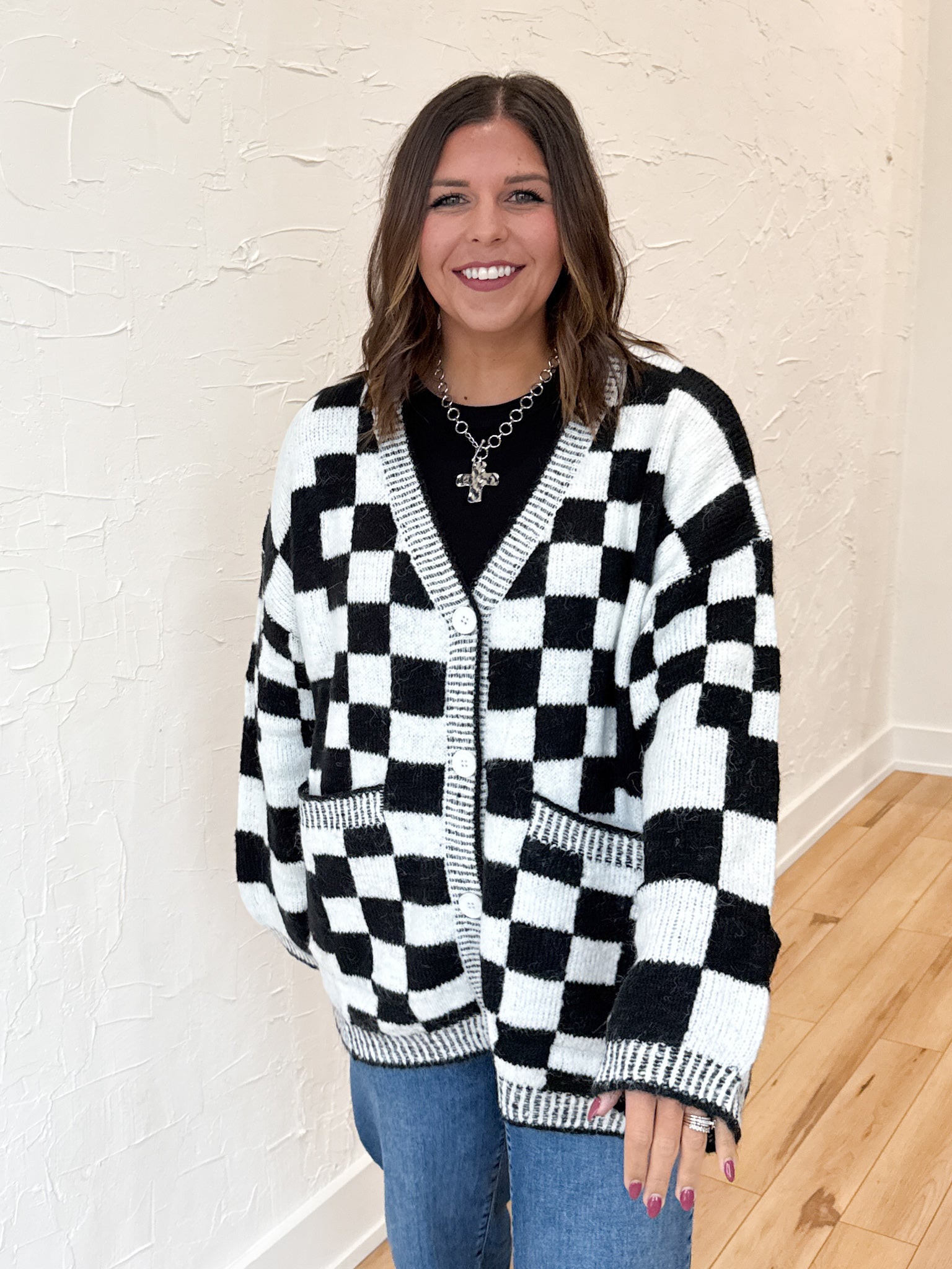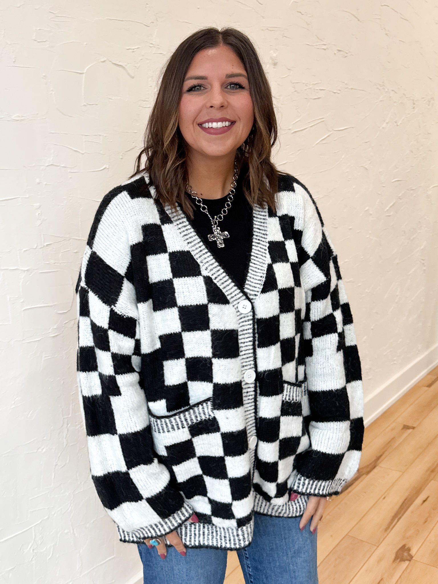 This relaxed-fit button-up cardigan brings all the fun with its playful checkered print pattern 🎉 Cozy yet lightweight, it’s the perfect layer for wherever your week takes you. Dress it up or keep it casual — it’s just as cute for game days as it is for dinner dates or church. Effortless, versatile, and full of personality — this is your new go-to cardigan for fall and beyond.