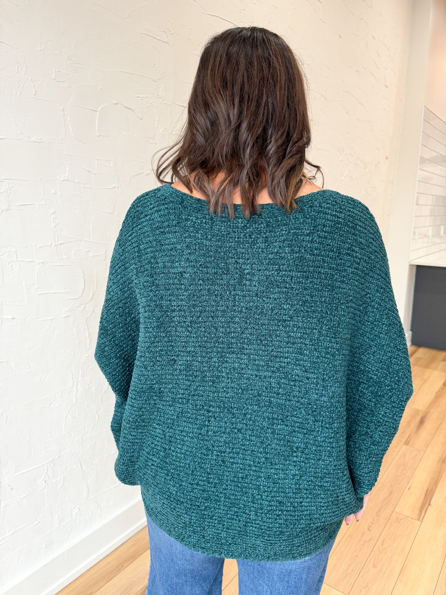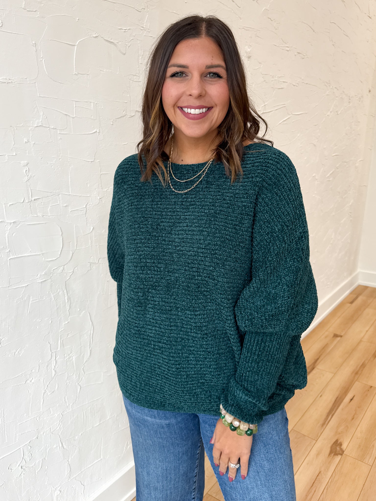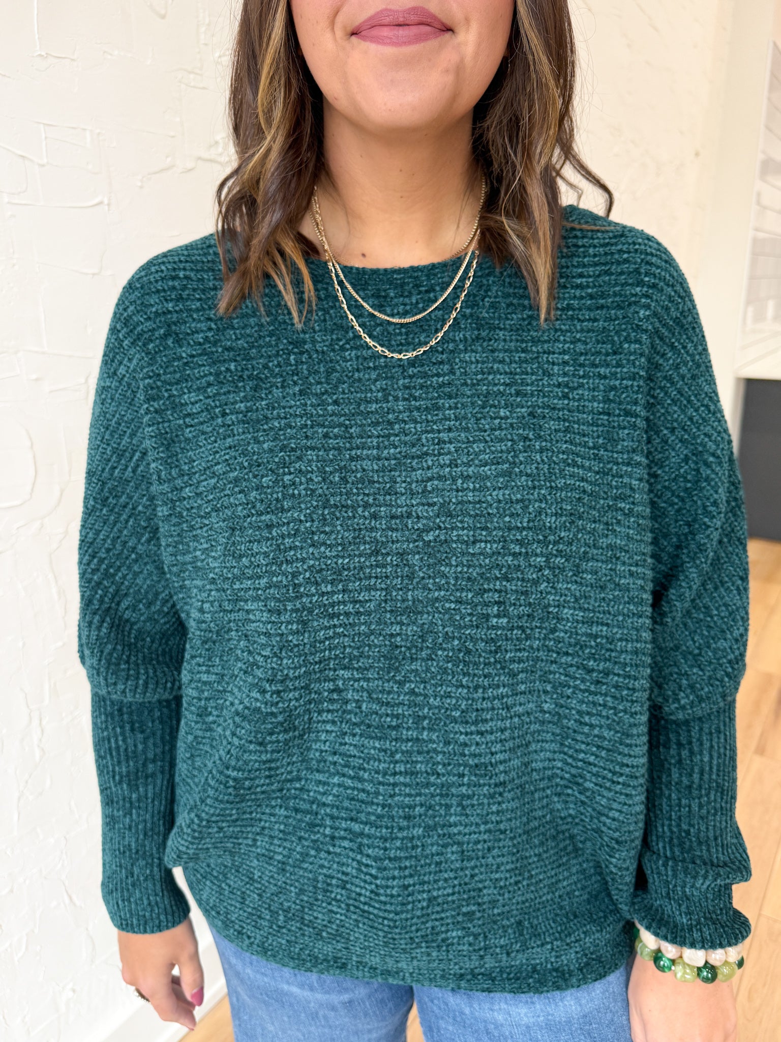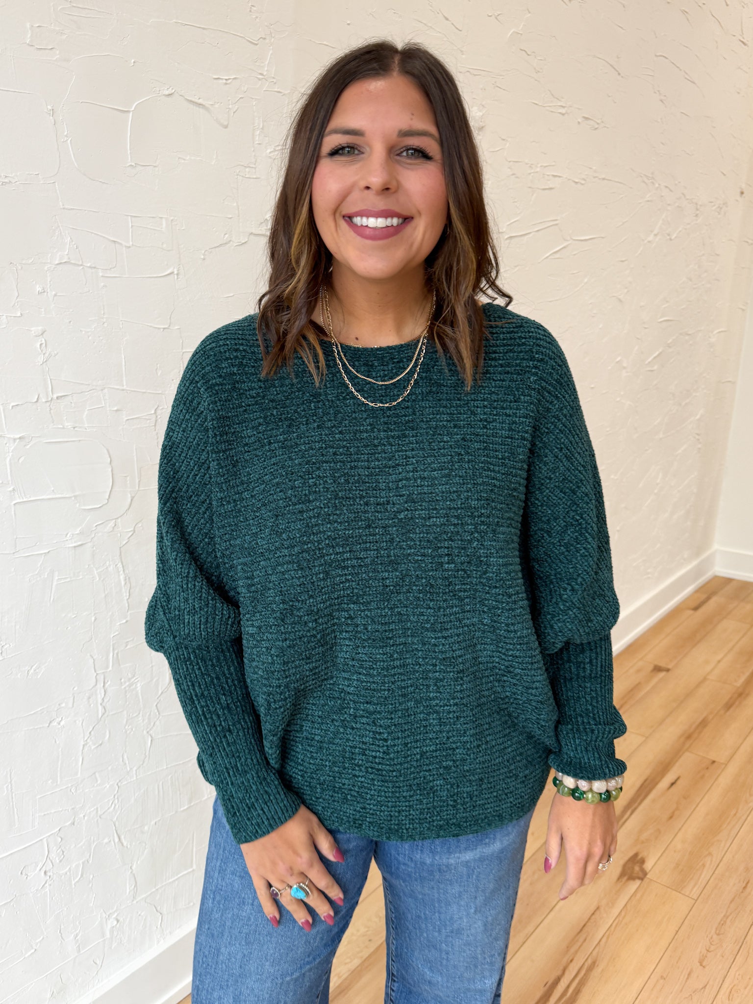 Wrap yourself in comfort with this ultra-soft chenille sweater in a gorgeous deep green hue. The cozy texture feels like wearing your favorite blanket, while the boat neckline and dolman sleeves create a flattering, easy fit for every body type. Whether you’re lounging at home or heading out for a casual day, this sweater brings the perfect mix of cozy and chic — effortless style you’ll want to live in all season long.