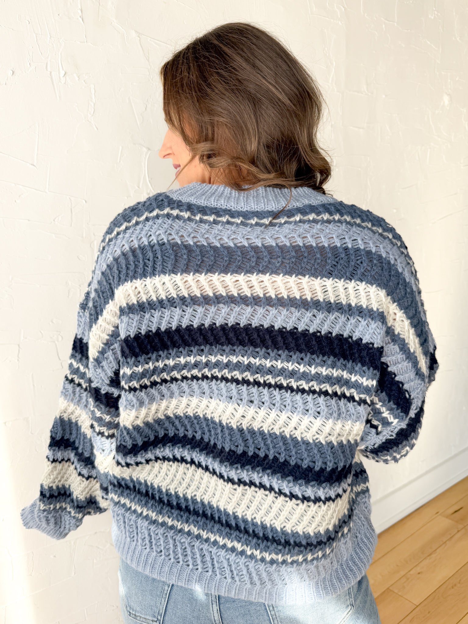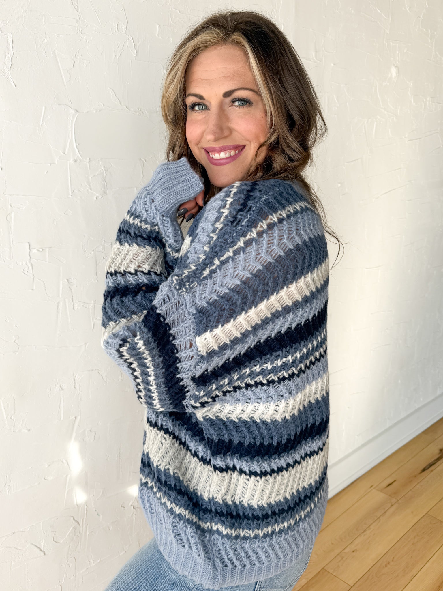 Stay cozy, cute, and comfy all season long. Featuring soft blue and ivory tones, this easygoing knit is perfect for those chilly Fall days—whether you’re headed into the office, out to brunch, or to church on Sunday. With its relaxed fit and timeless stripes, it’s an effortless piece you’ll love reaching for again and again.