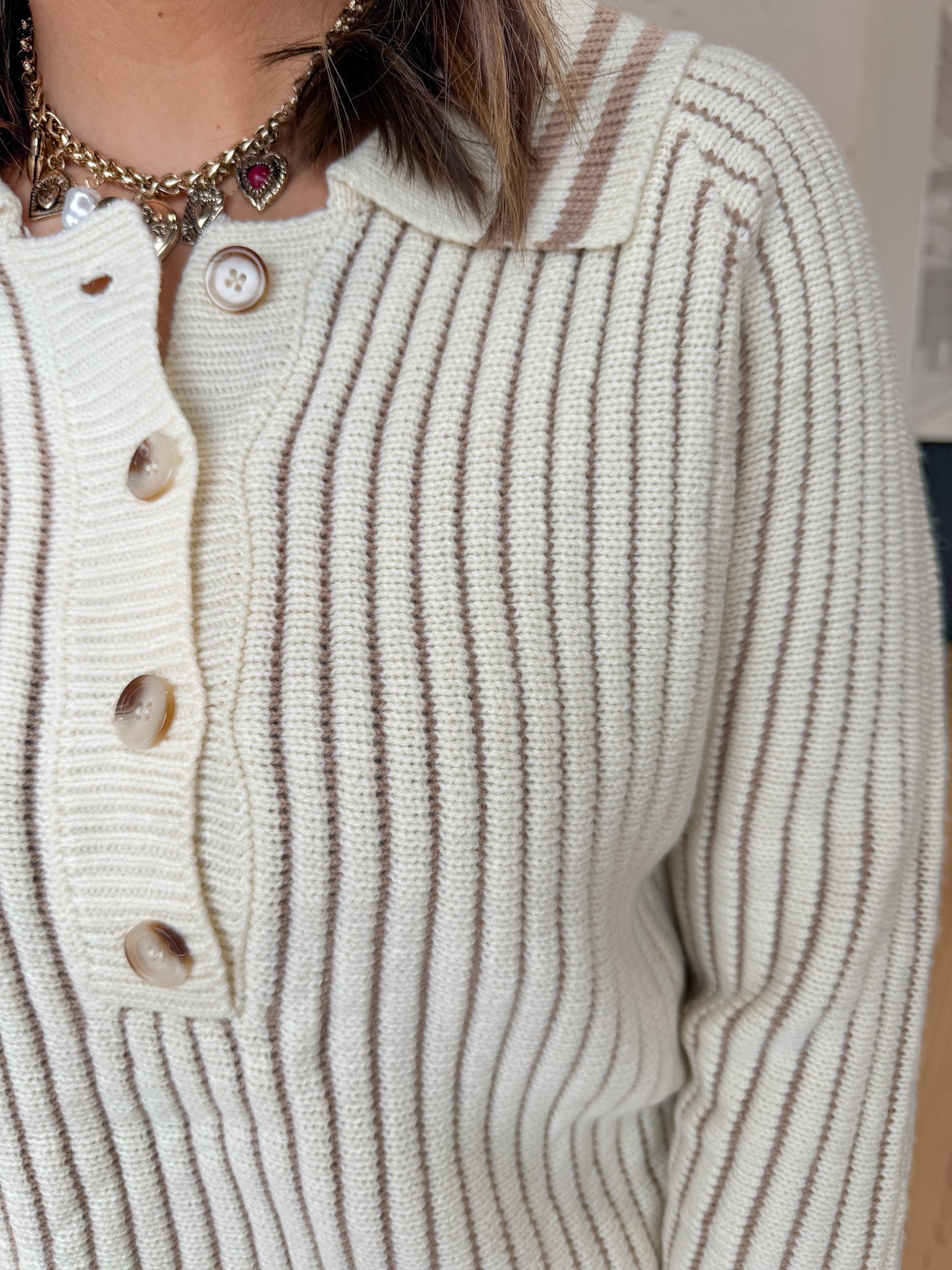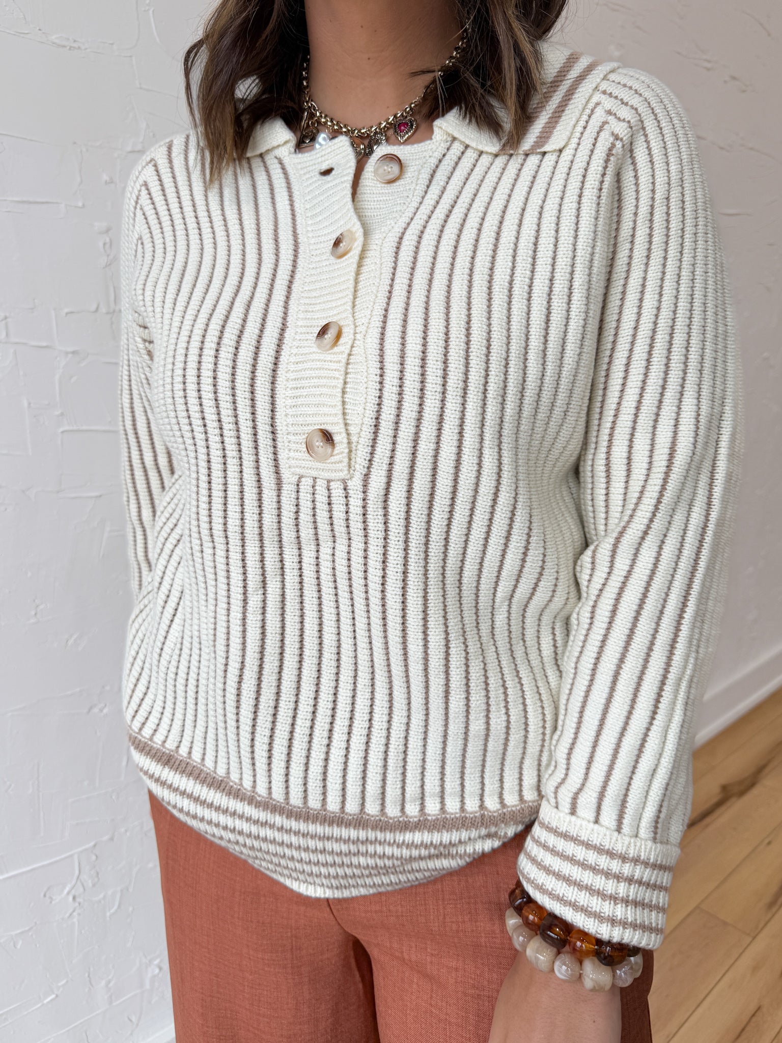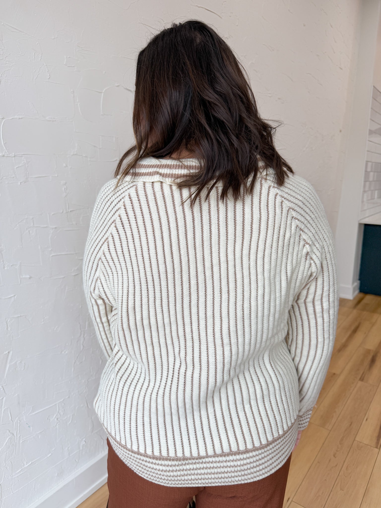 This collared sweater is the definition of simple sophistication. With its neutral stripe pattern and classic design, it’s a versatile piece that transitions seamlessly from the office to church to a night out. The soft knit and polished collar give it an elevated feel, while the subtle stripe adds just the right touch of fun. Effortlessly chic and endlessly wearable — it’s a must-have for your fall lineup.