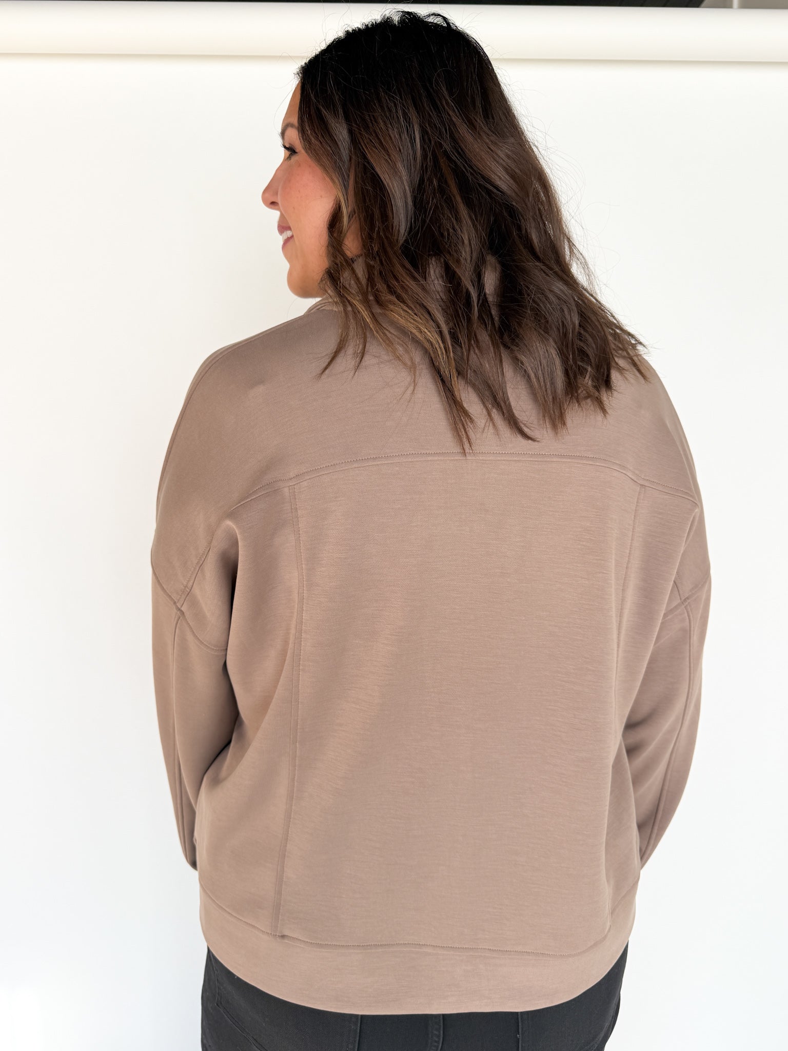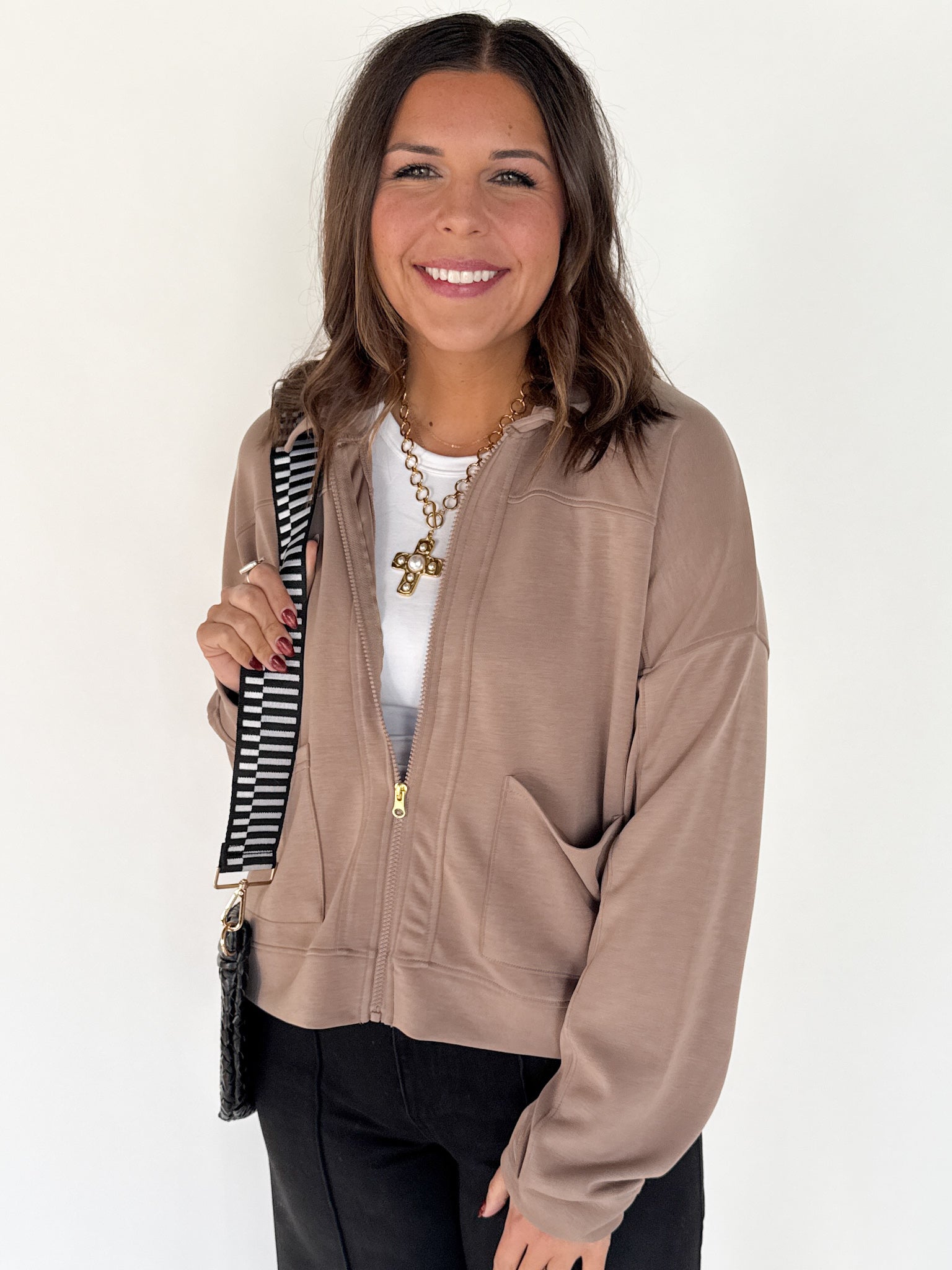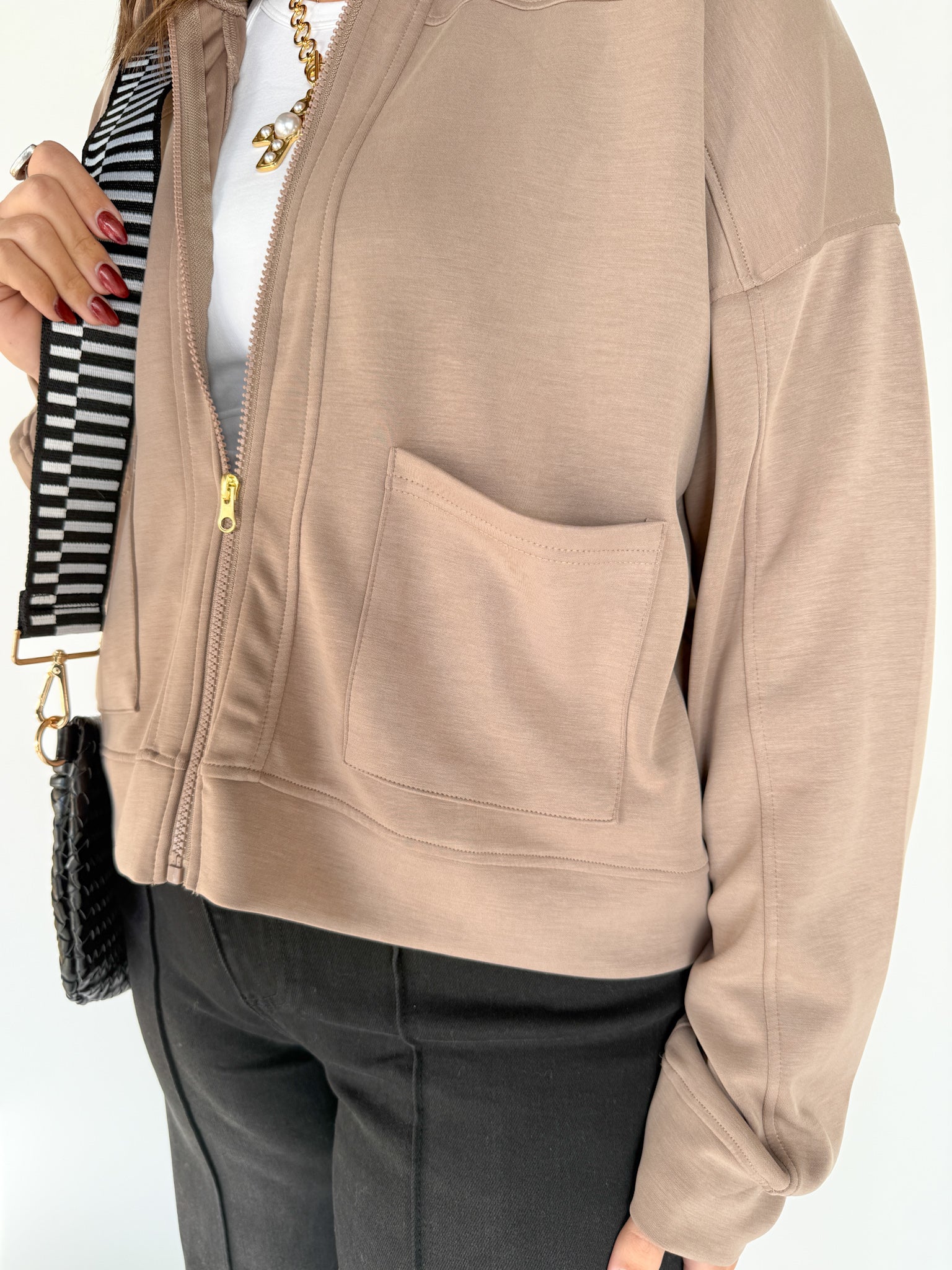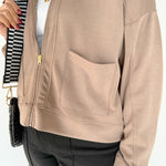A sleek, modern layer made to elevate your everyday. This structured collared zip-up jacket is crafted from our signature heavy-weight, sand-washed scuba fabric—silky-smooth with a beautiful, effortless drape. Designed in a relaxed fit with front patch pockets for a hint of utility, it blends polish and comfort in one easy piece. The perfect jacket for taking your look from lounge to street with style.