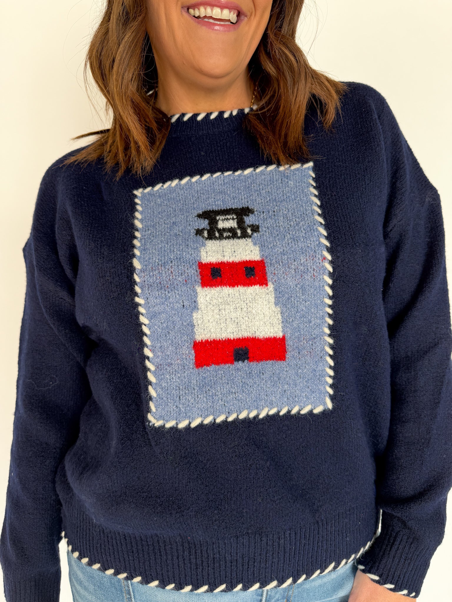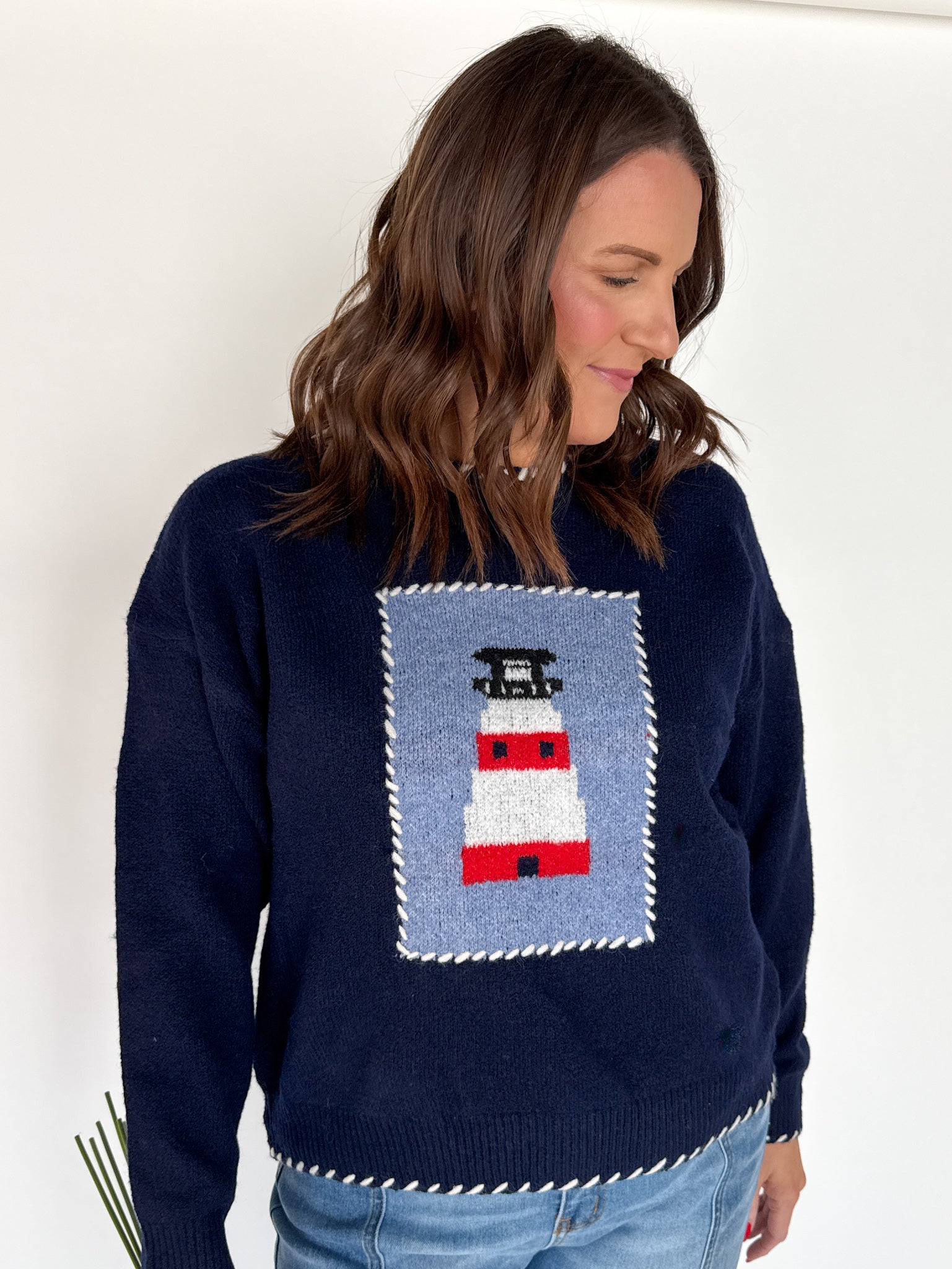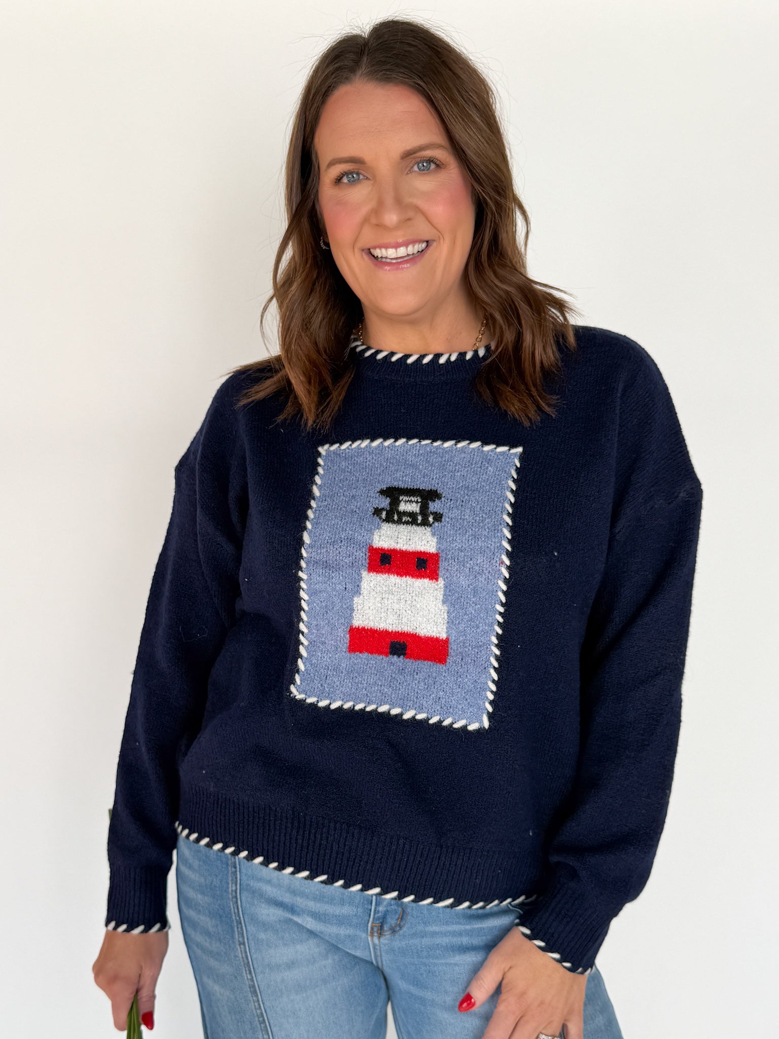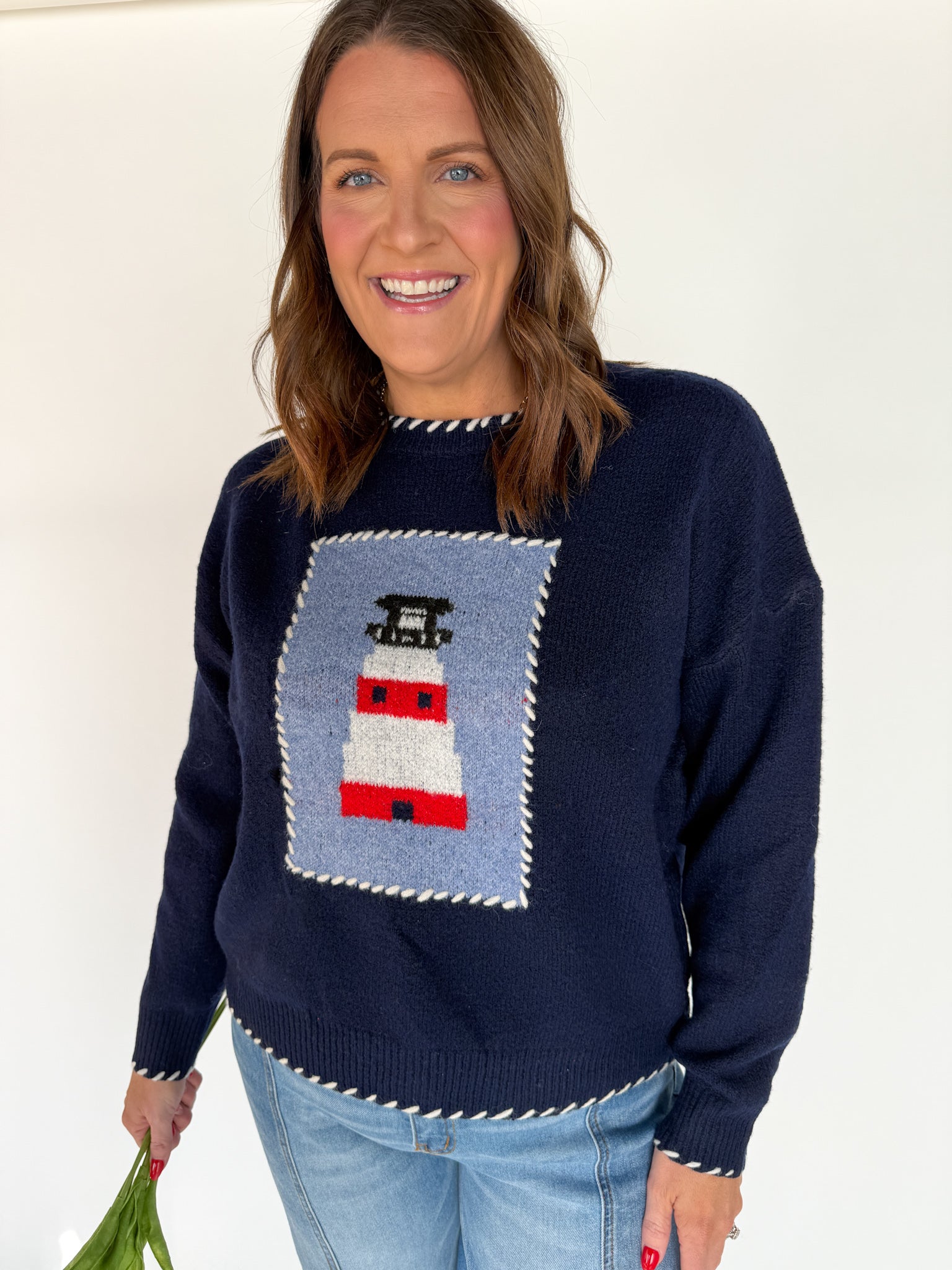 Lightweight, cozy, and full of character—this relaxed-fit sweater with a lighthouse icon is perfect for layering or wearing solo. Whether you’re seaside-bound or just love a fun, nautical touch, it’s the sweater that makes every outfit a little brighter.