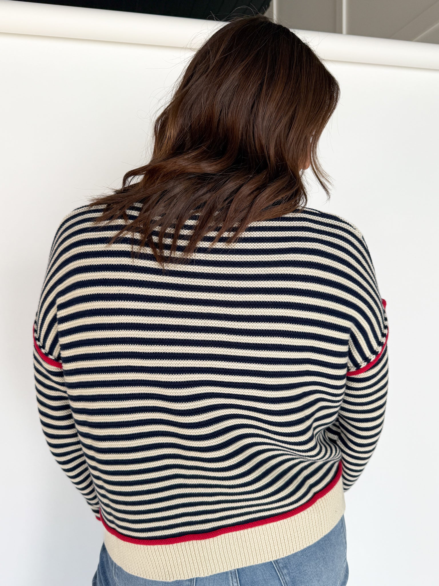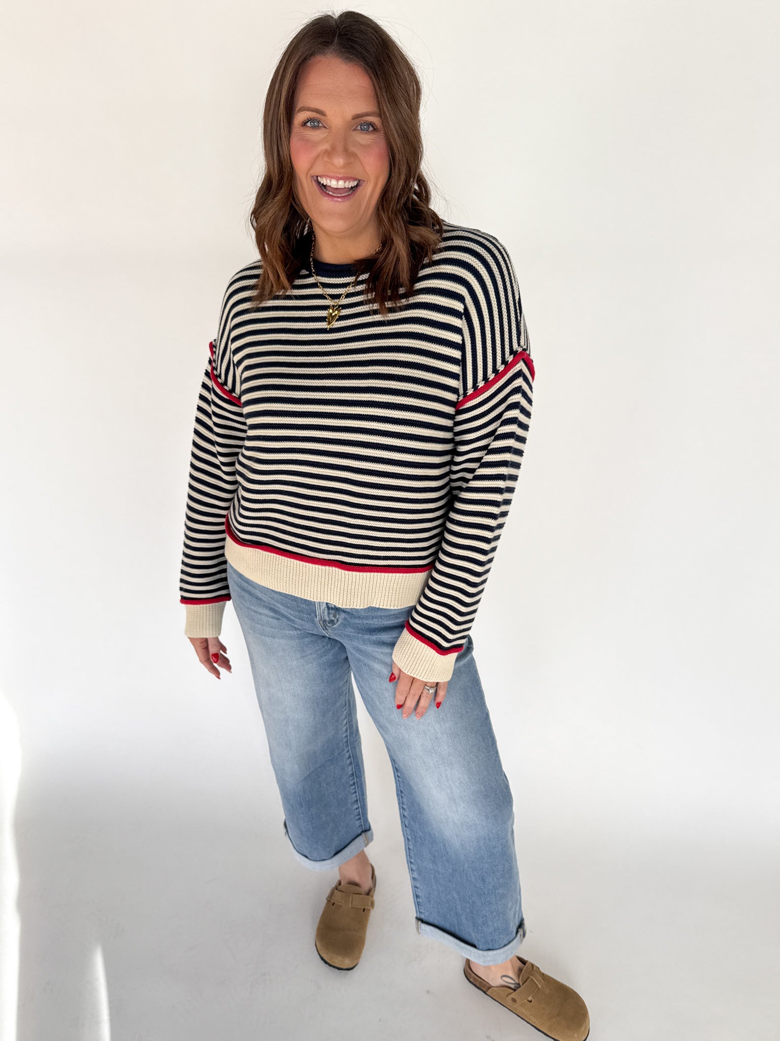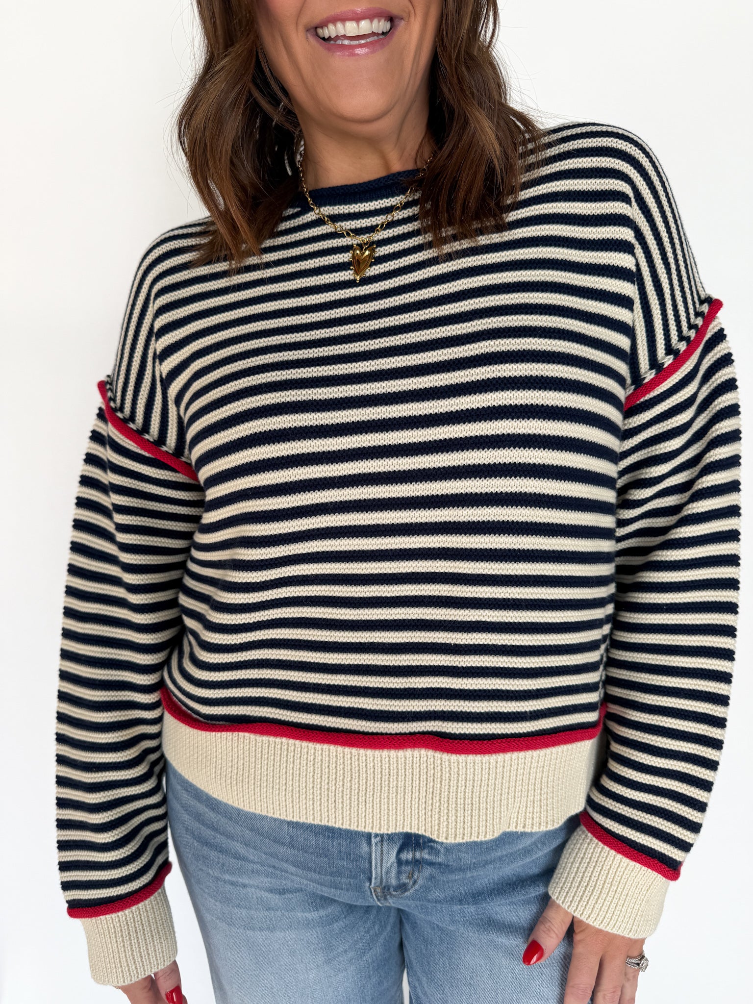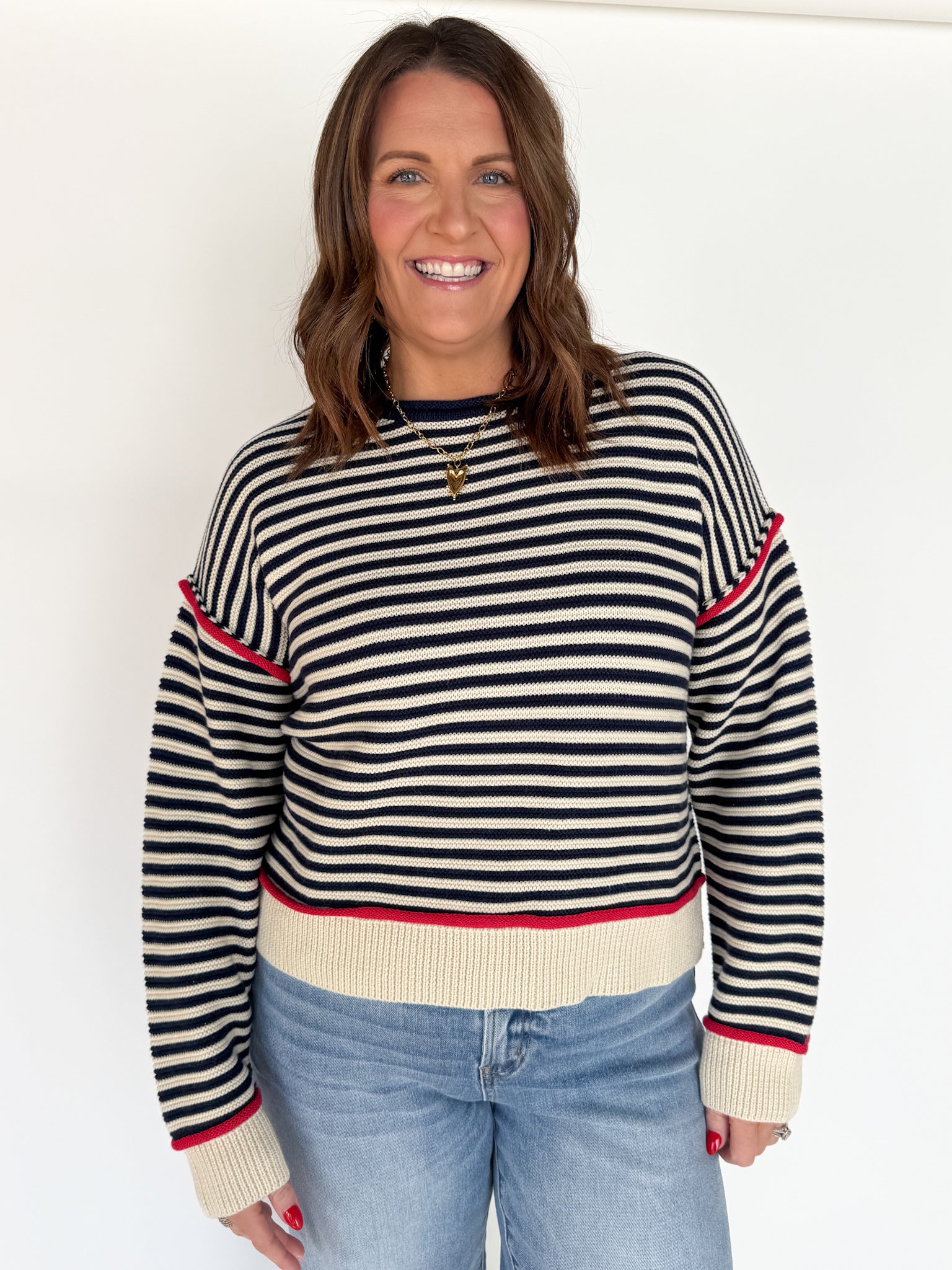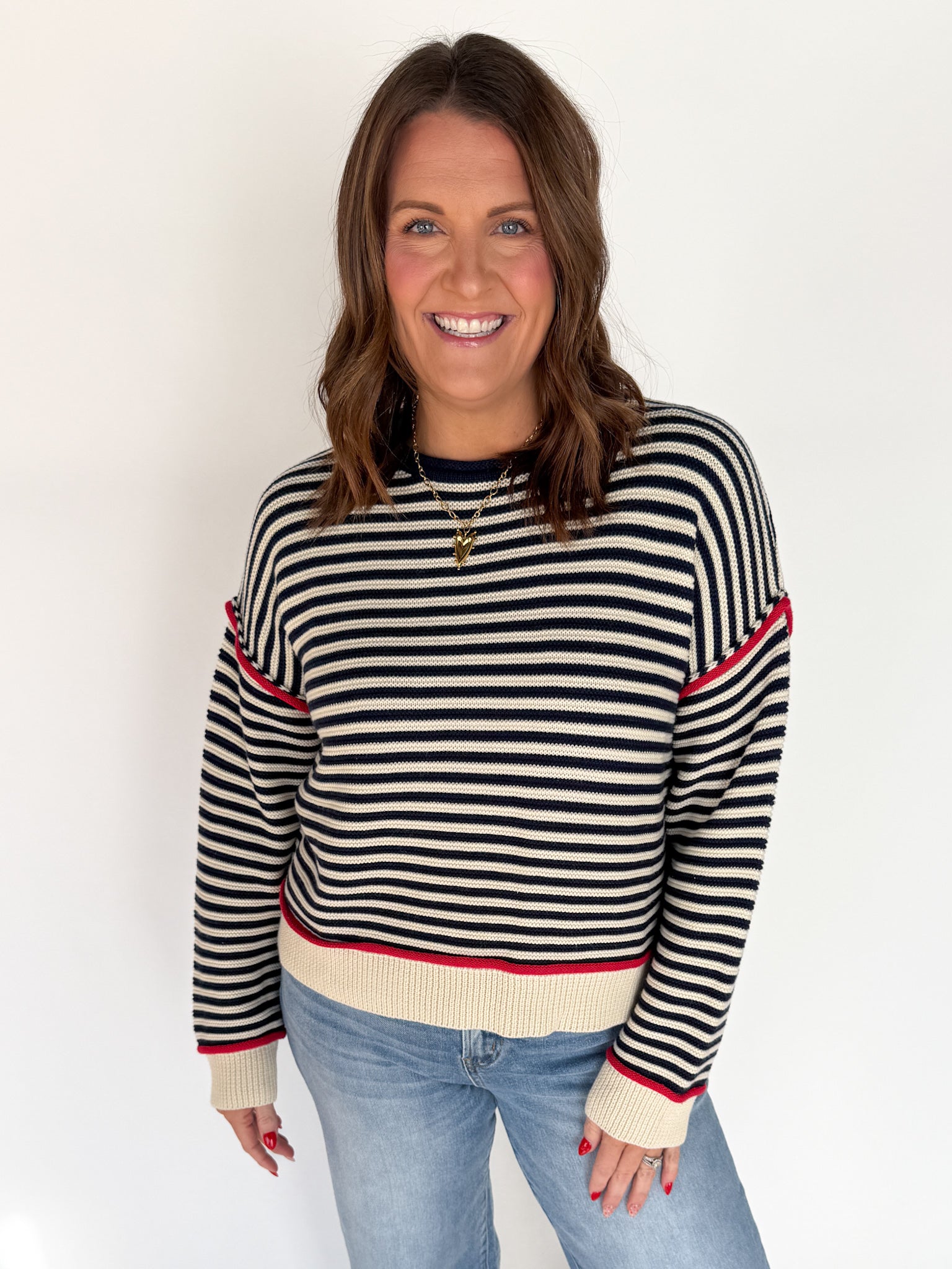 Simple, polished, and endlessly wearable. This navy striped sweater features a clean red trim that adds a touch of charm without being overpowering. It’s the perfect throw-on-and-go sweater for busy days when you still want to feel put together.