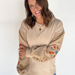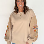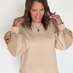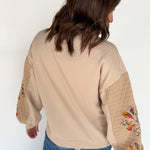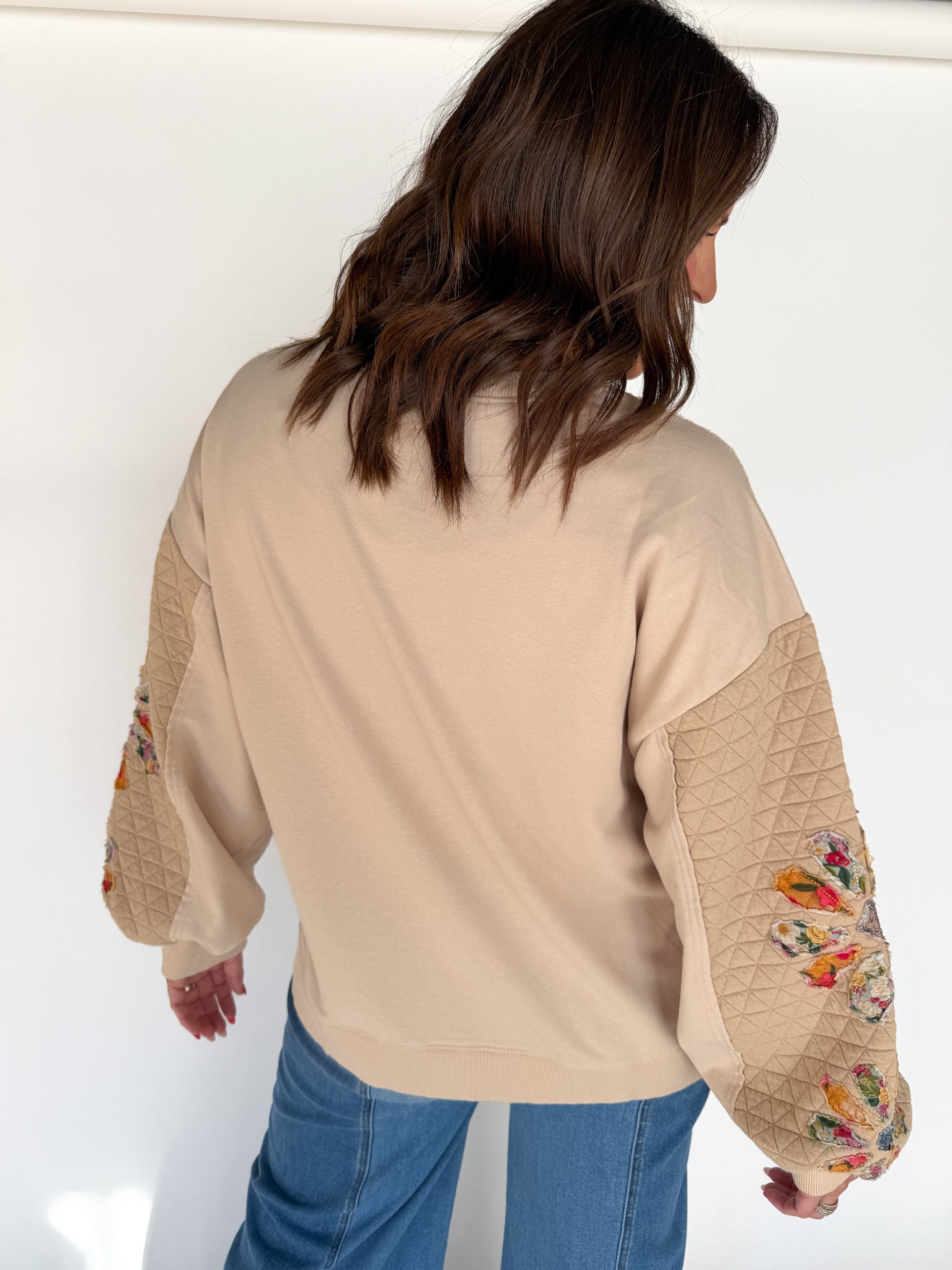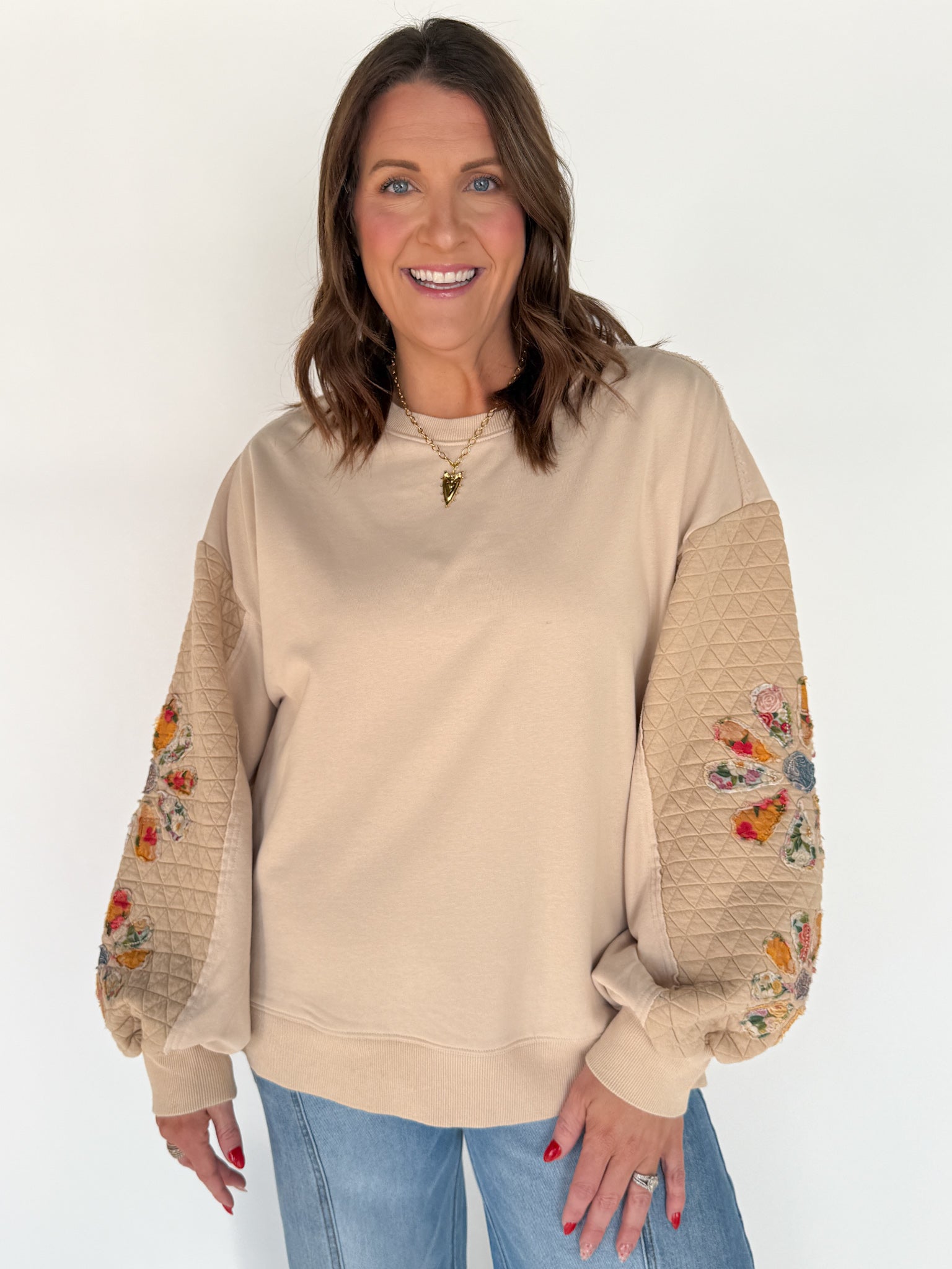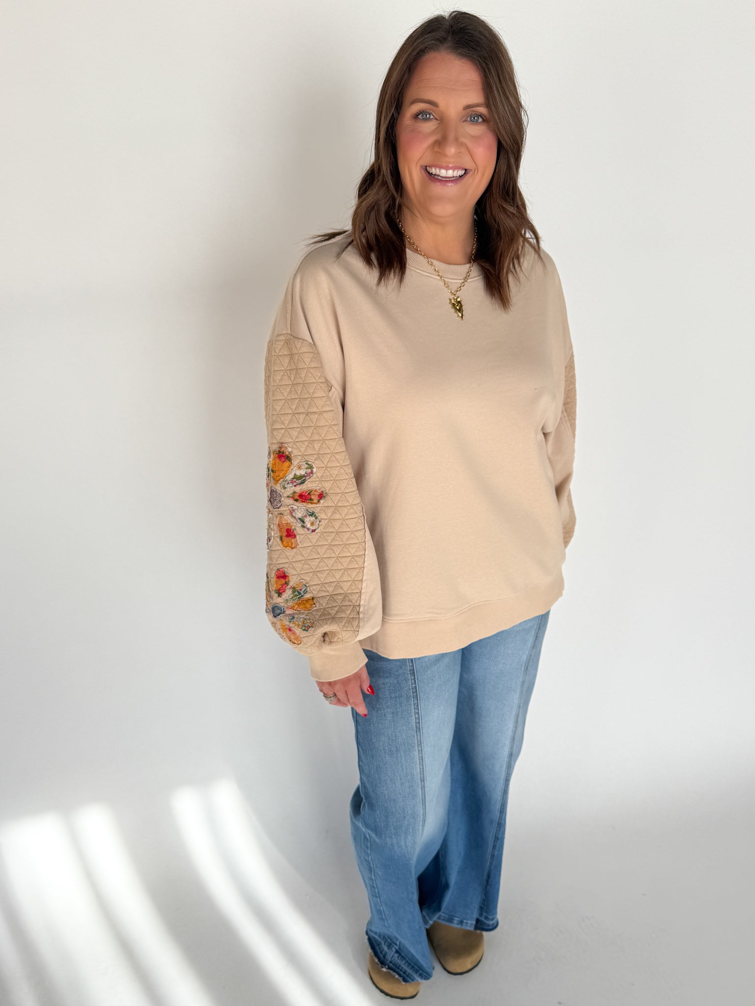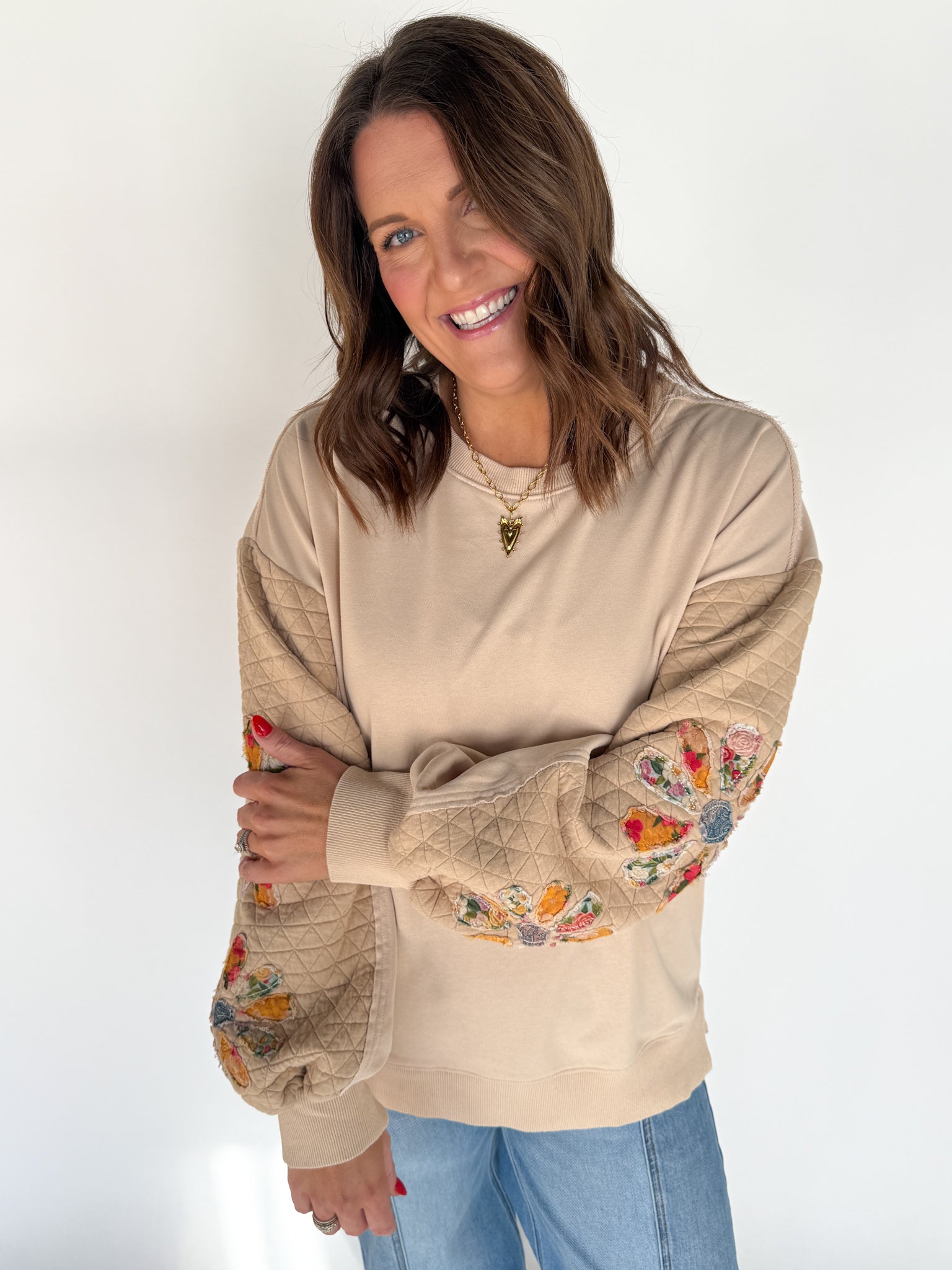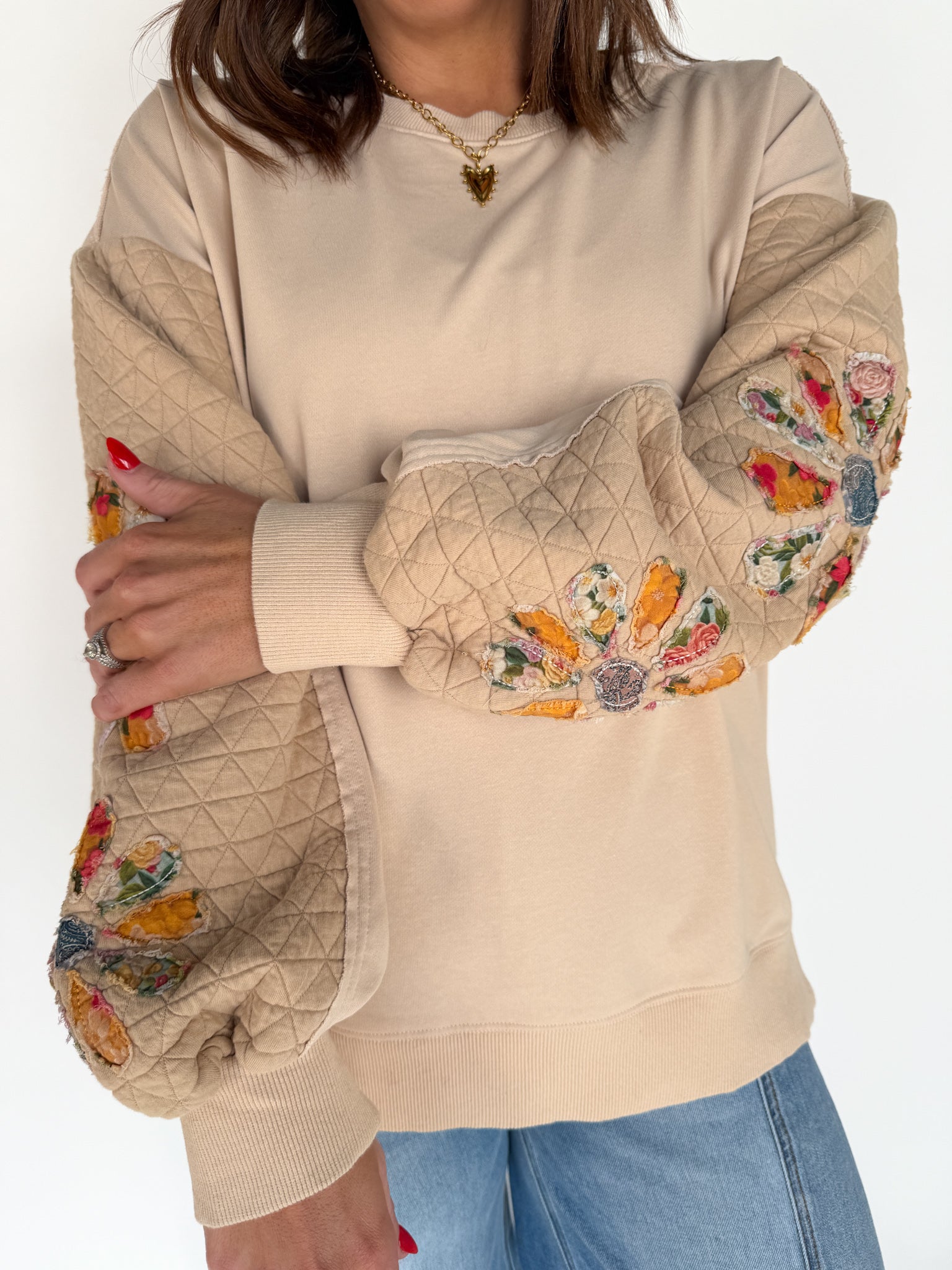 This pullover sweatshirt features beautifully quilted floral sleeves that instantly elevate a classic silhouette. It’s soft, comfortable, and full of heart—one of those pieces that feels like a warm hug and makes you smile thinking about growing up and simpler times.
