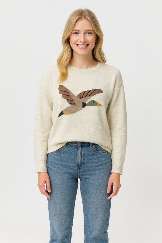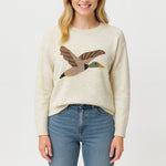 This soft knit sweater brings a playful dose of outdoorsy charm with its adorable mallard duck graphic front and center. Designed in a relaxed fit with classic ribbed trim, it's the perfect blend of cozy, quirky, and irresistibly cute. Throw it on for those crisp days or anytime you want a touch of woodland whimsy in your wardrobe.