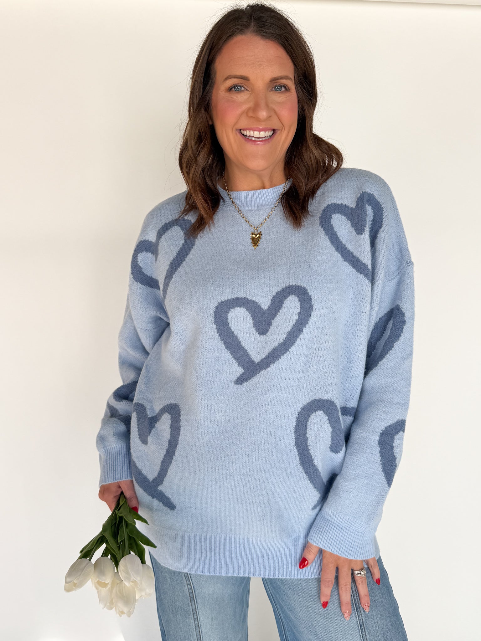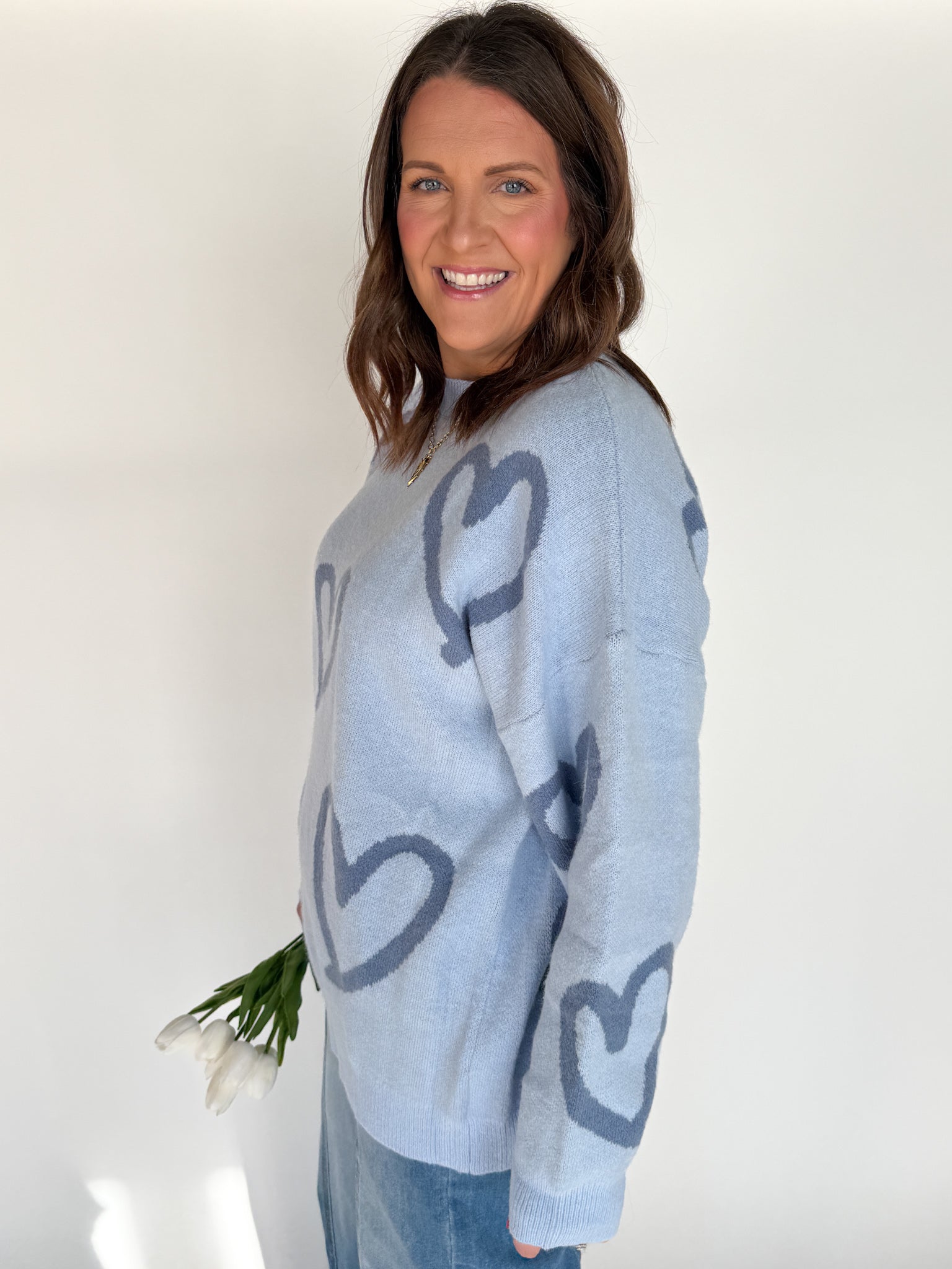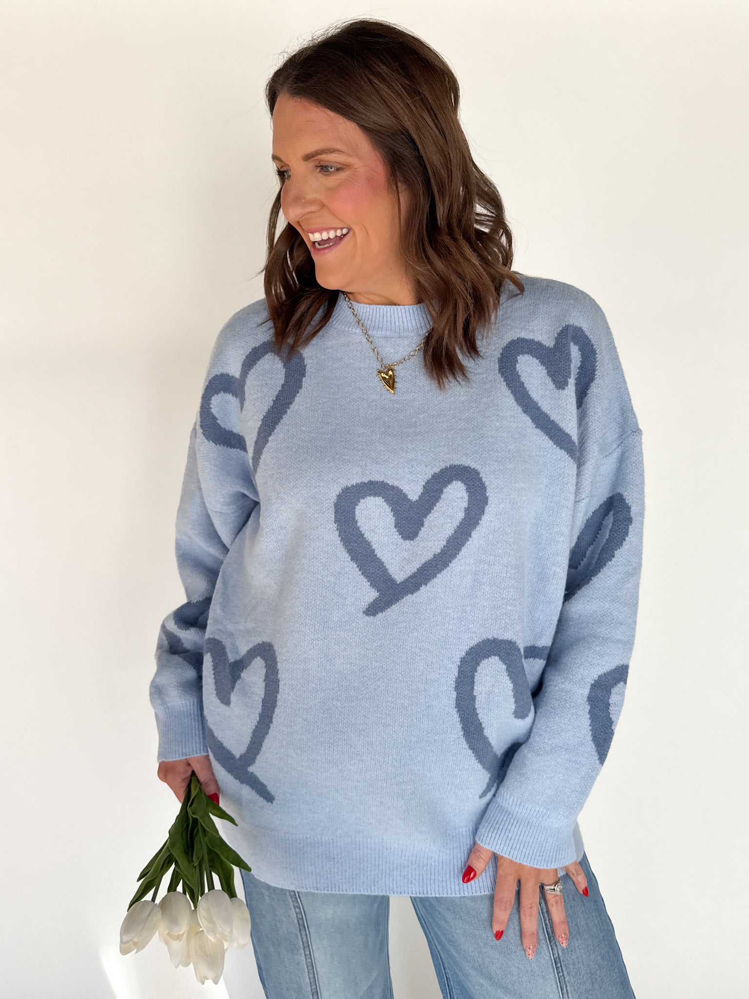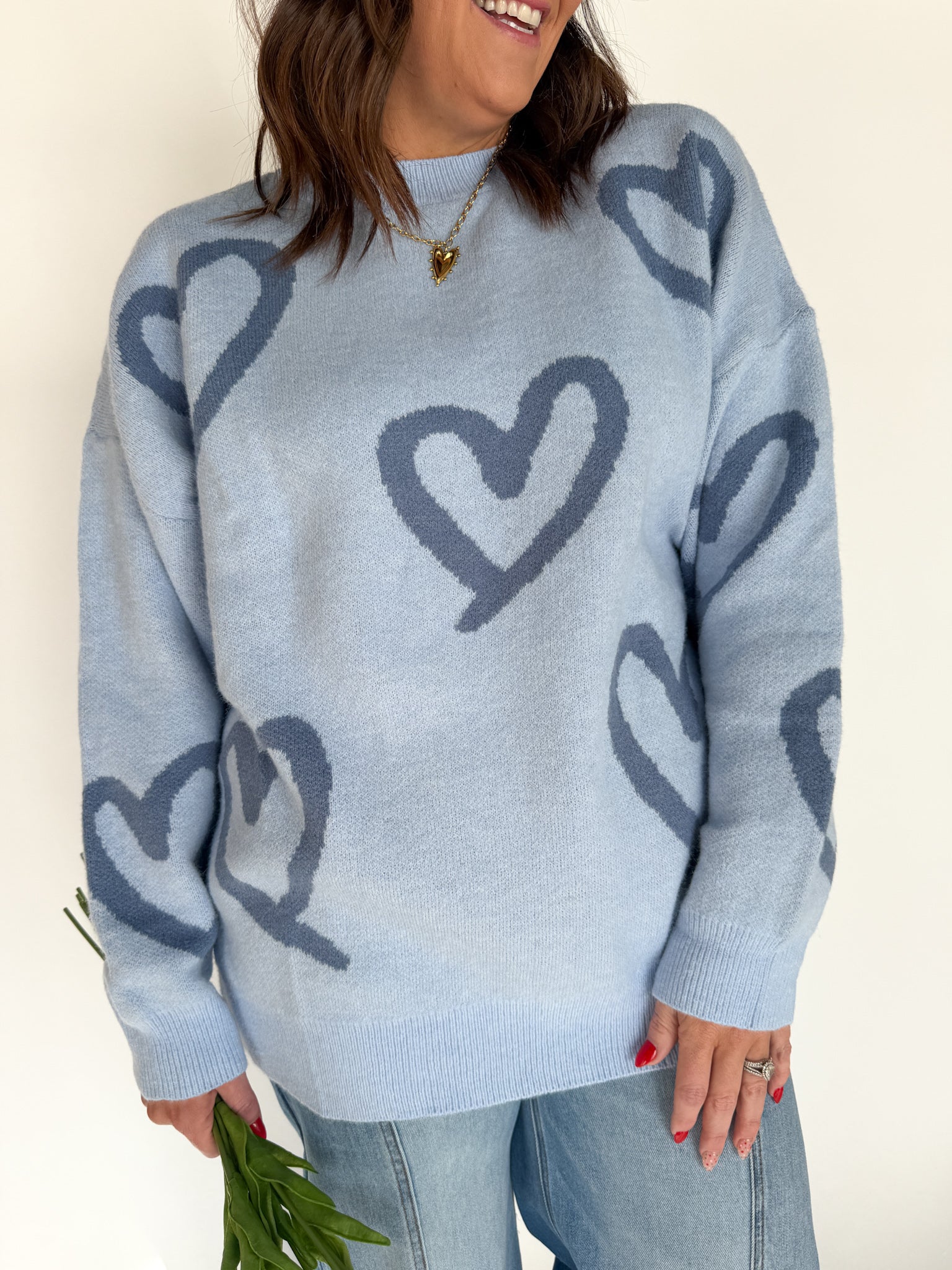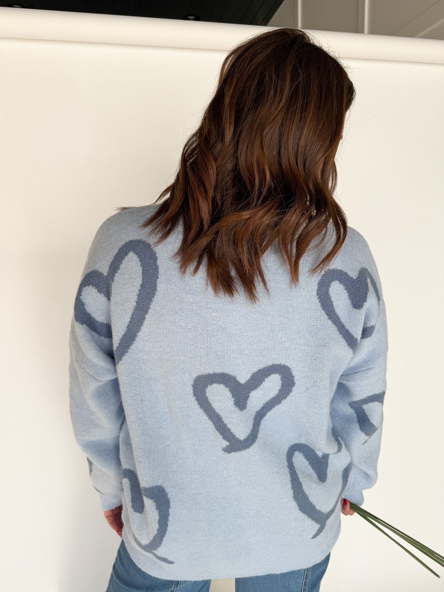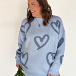 A cozy oversized sweater with painted hearts that add just the right amount of personality. The pretty blue shade is ideal for anyone who prefers cool tones over pink, and the relaxed fit makes it an easy favorite.