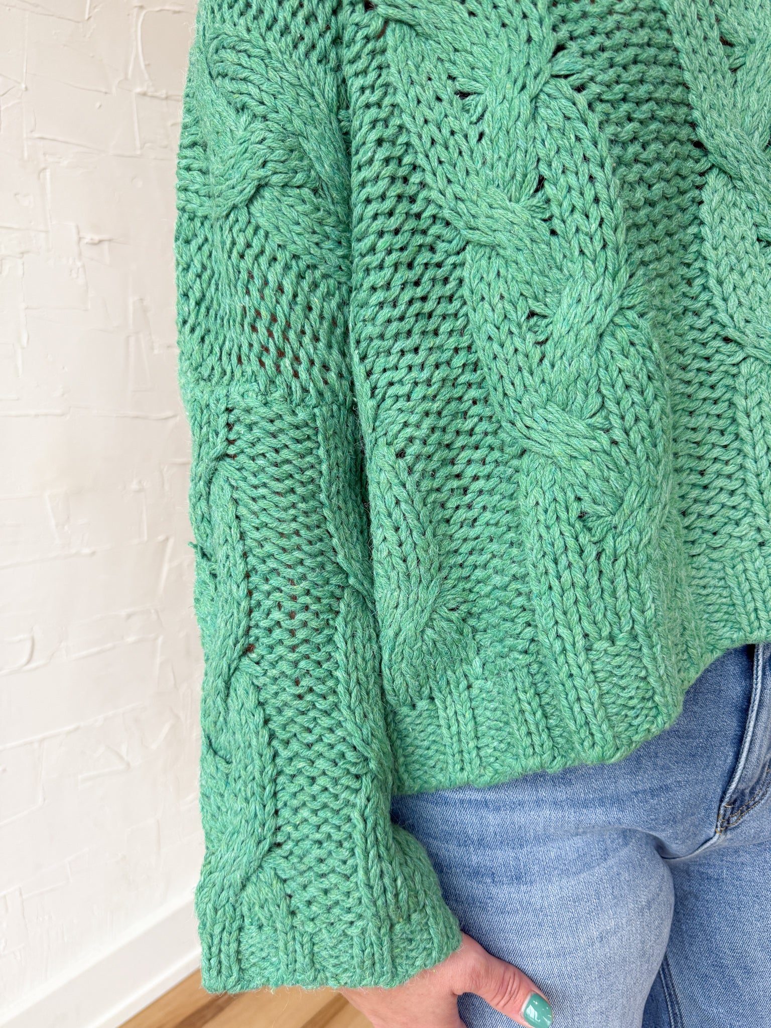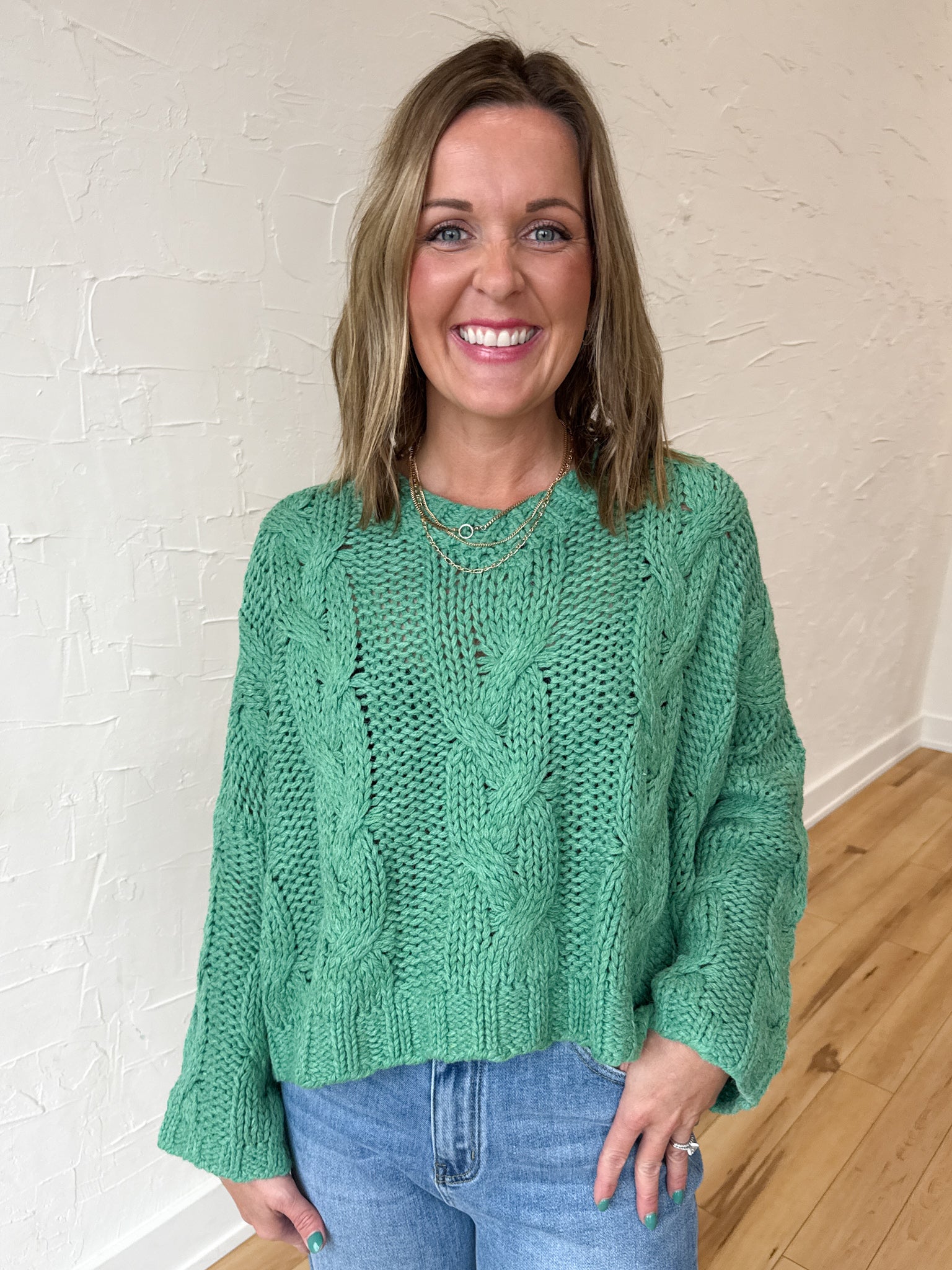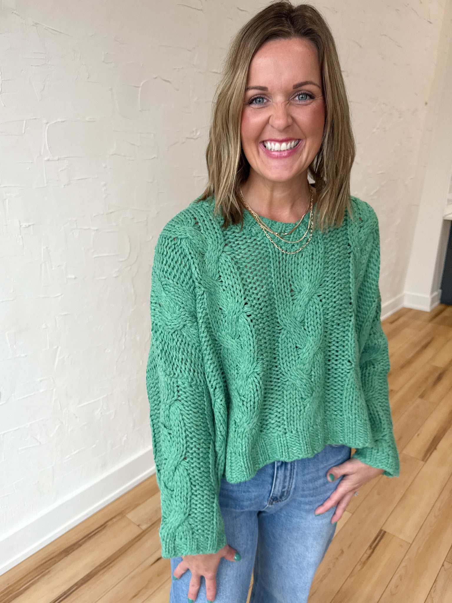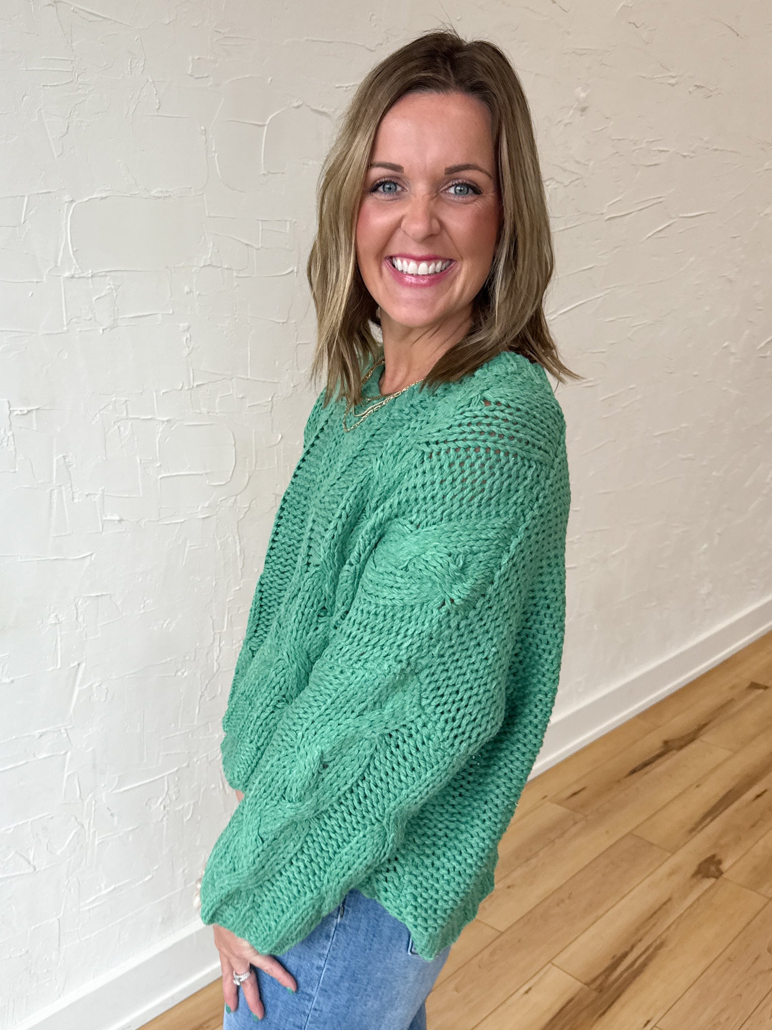 This gorgeous green cable knit sweater is cozy, comfy, and full of charm! The rich hue and timeless knit design make it a standout piece for fall. It’s the kind of sweater that makes you want to grab a hot cup of coffee and catch up with your girlfriends. Effortless to style and easy to wear from brunch to church, it’s the perfect mix of classic comfort and everyday style.