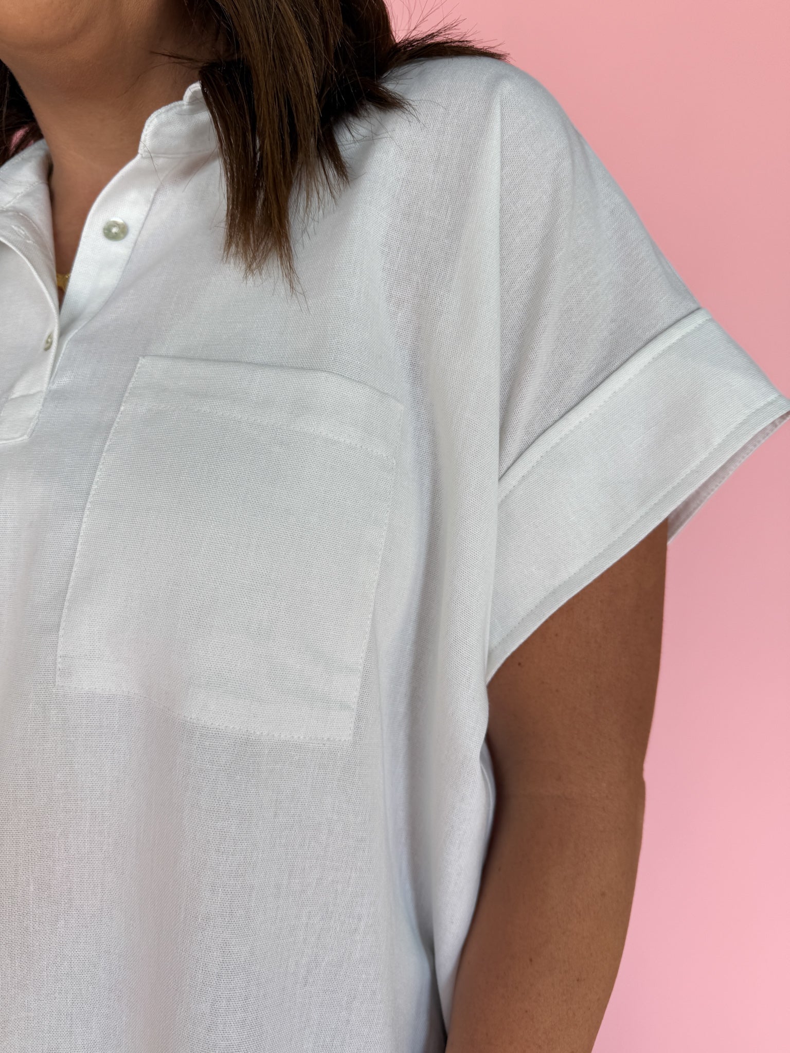 Clean, classic, and endlessly versatile. This white short sleeve top features a three-quarter button-up front and a lightweight linen blend that keeps things breathable and easy. It’s the kind of piece that instantly elevates your everyday while still feeling effortless.