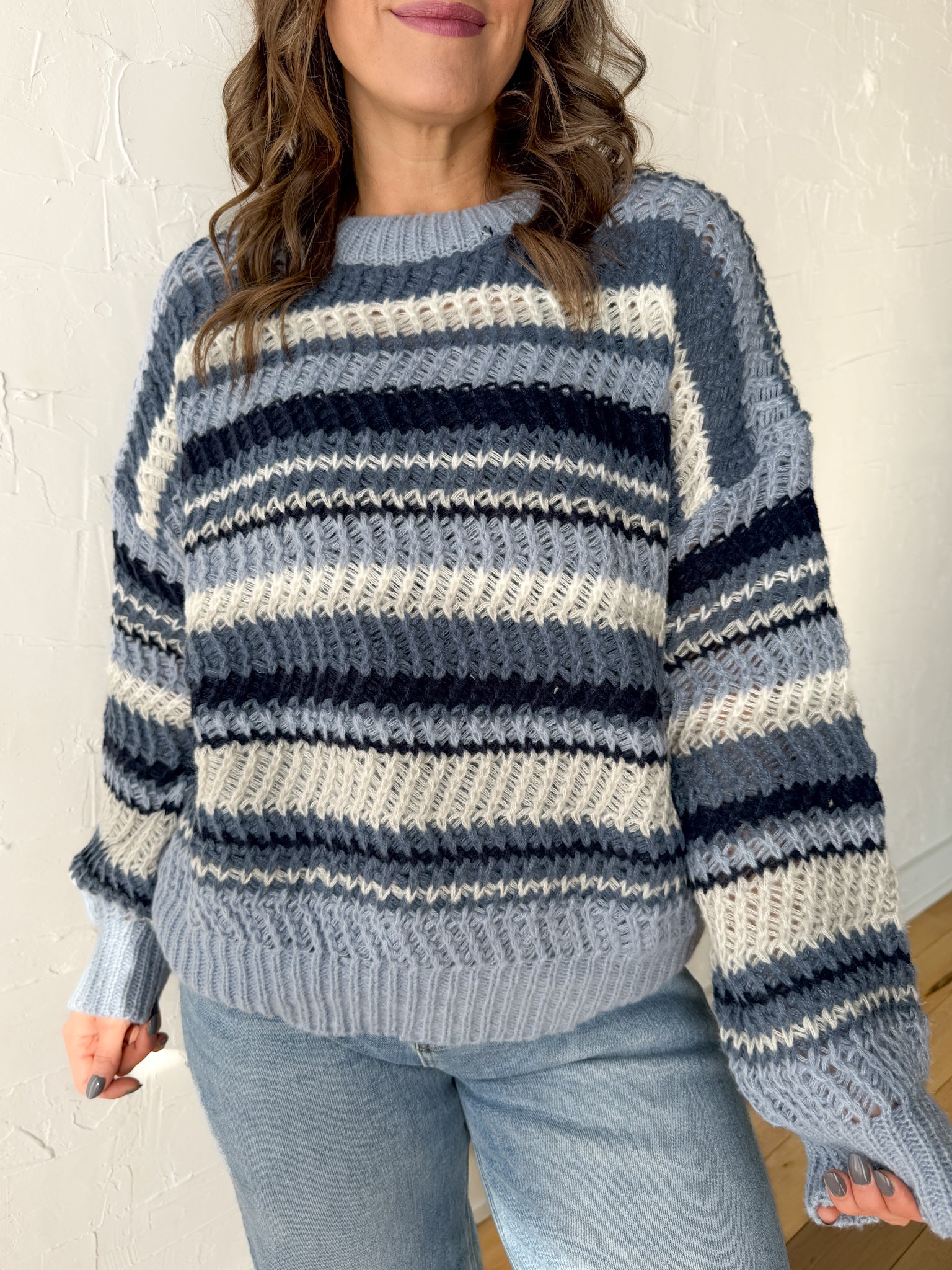 Stay cozy, cute, and comfy all season long. Featuring soft blue and ivory tones, this easygoing knit is perfect for those chilly Fall days—whether you’re headed into the office, out to brunch, or to church on Sunday. With its relaxed fit and timeless stripes, it’s an effortless piece you’ll love reaching for again and again.