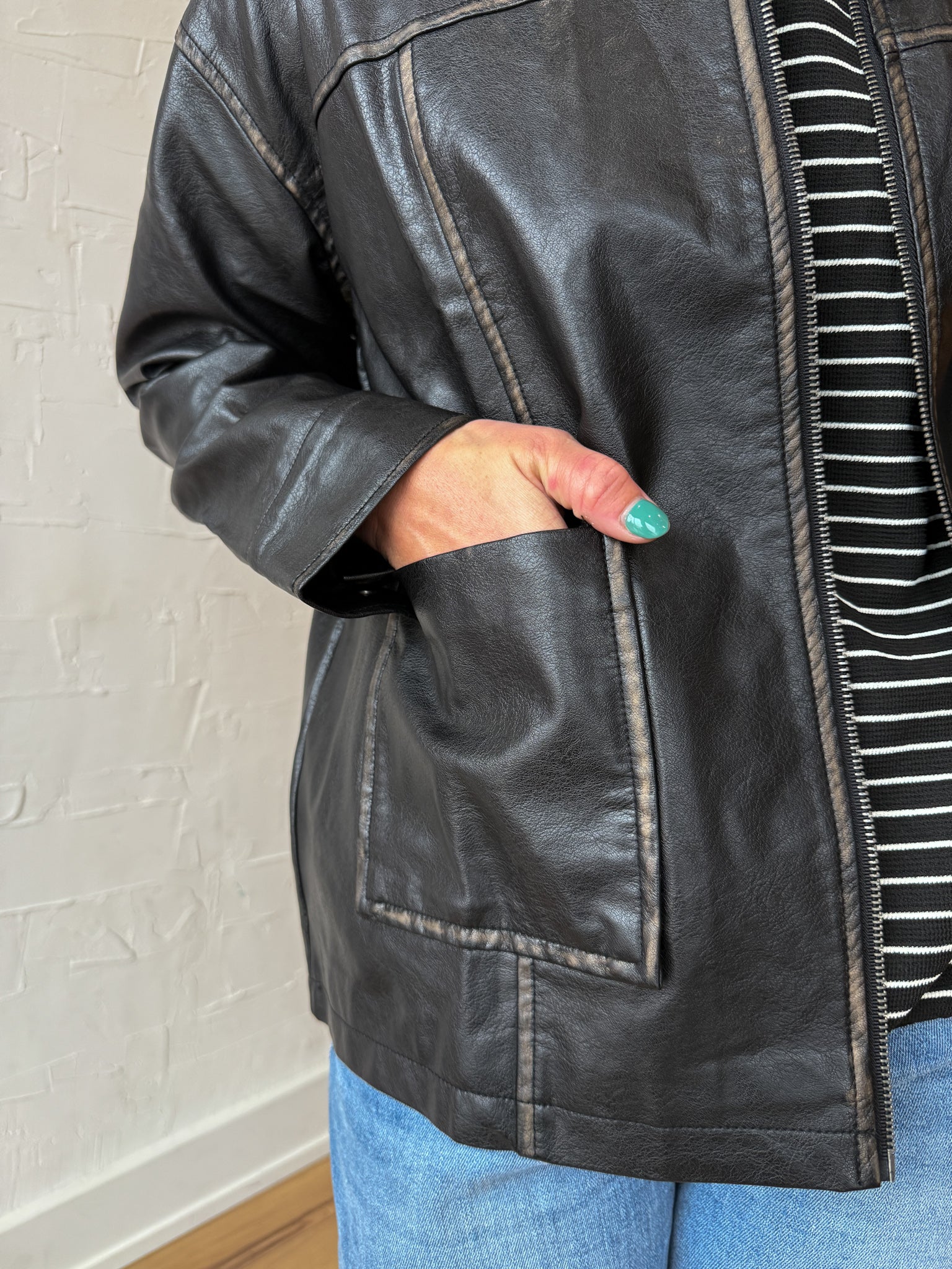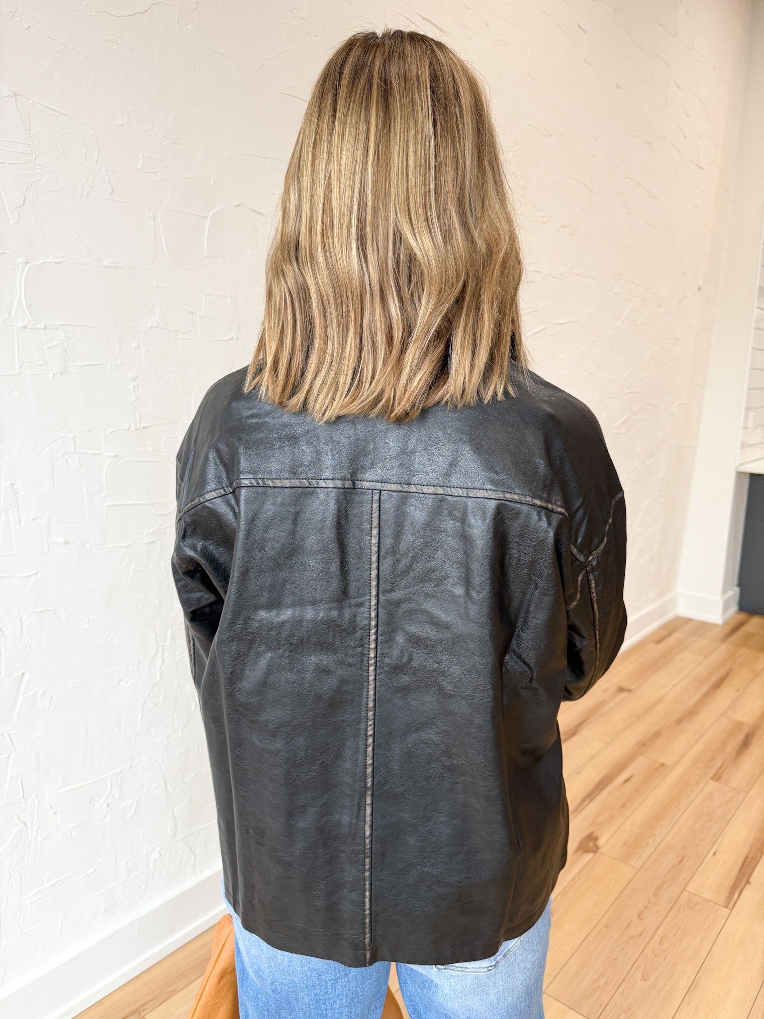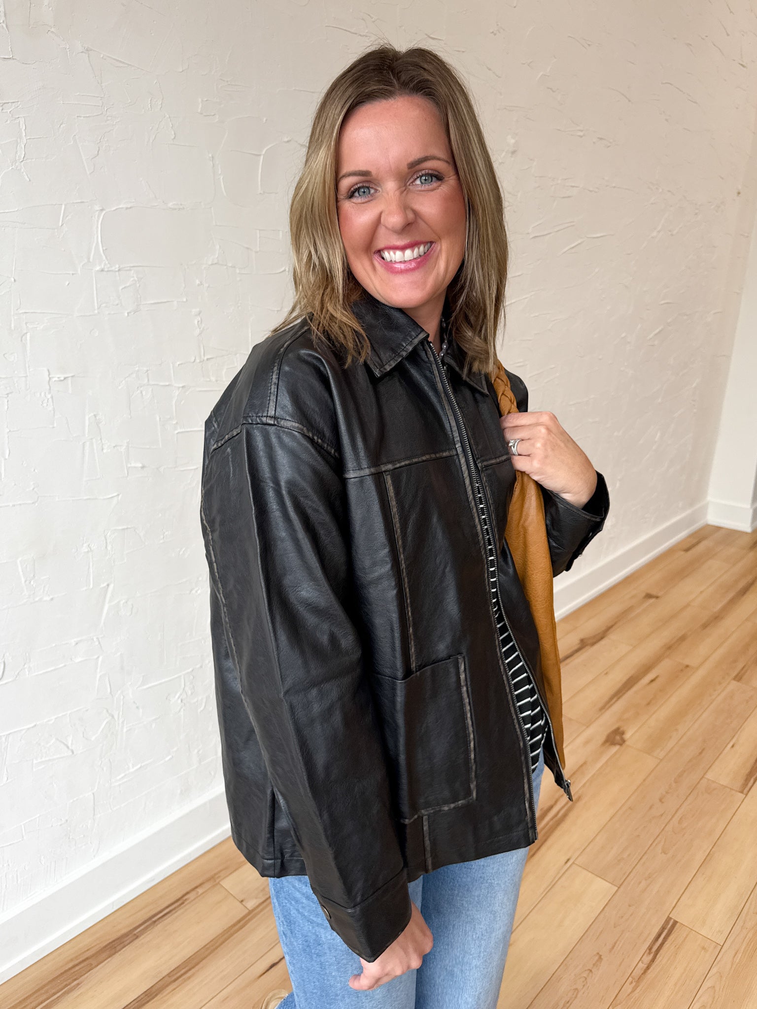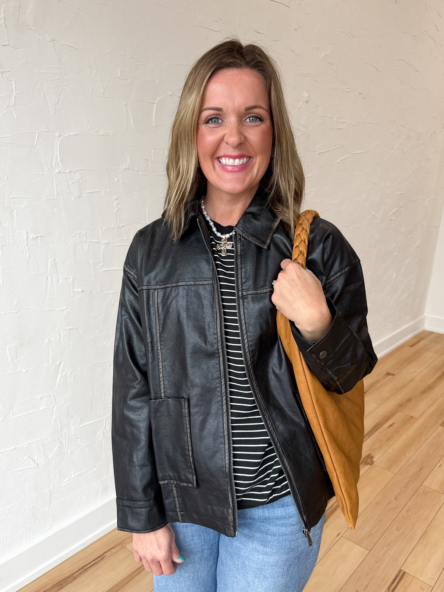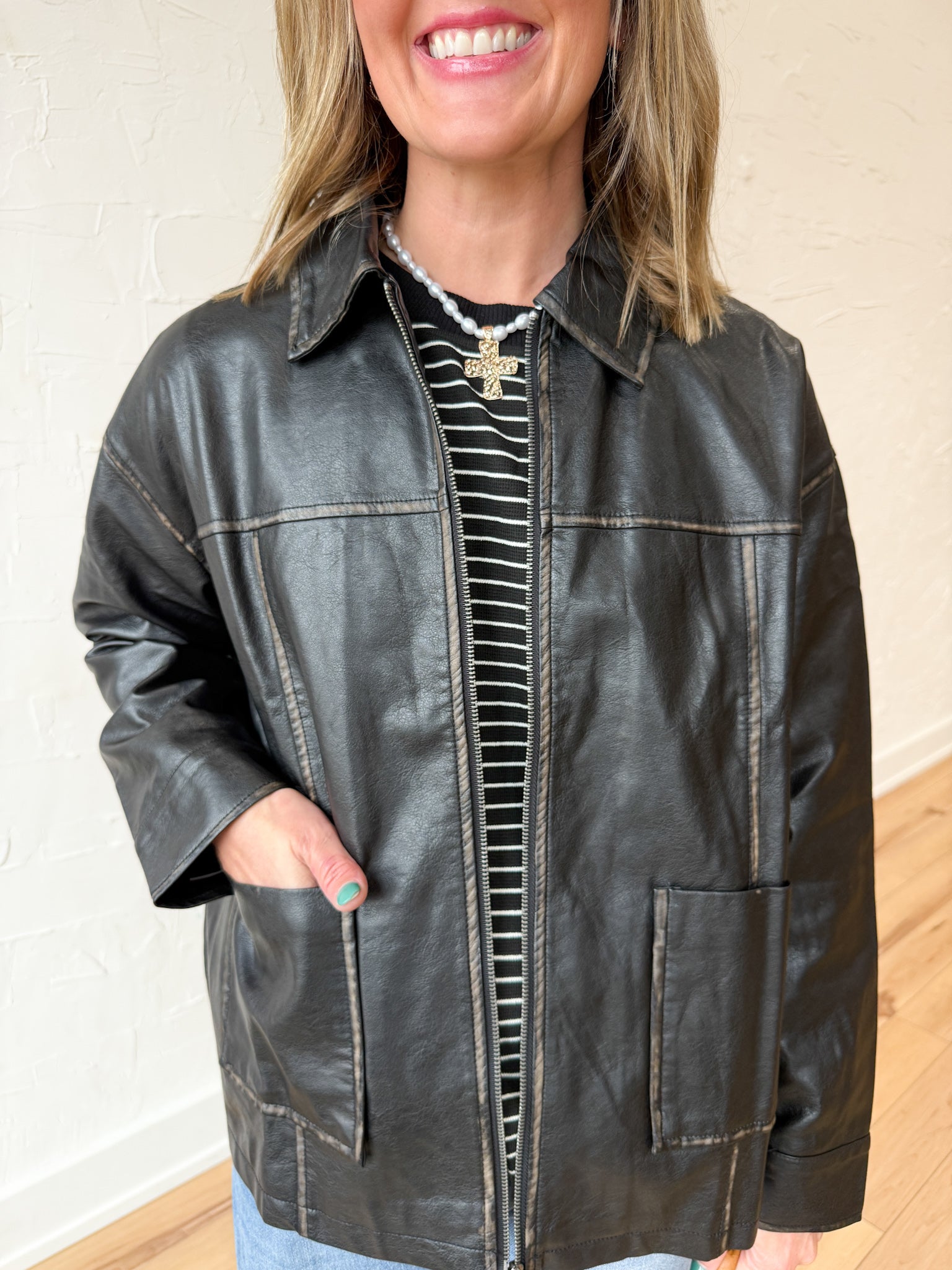 This faux leather jacket is the ultimate throw-on-and-go piece that instantly elevates any look. Stylish and chic, it gives off that effortlessly cool vibe while making you look 100% put together — no extra effort required. Perfect for the office, date night, or anywhere in between, it’s a timeless wardrobe staple you’ll reach for again and again.
