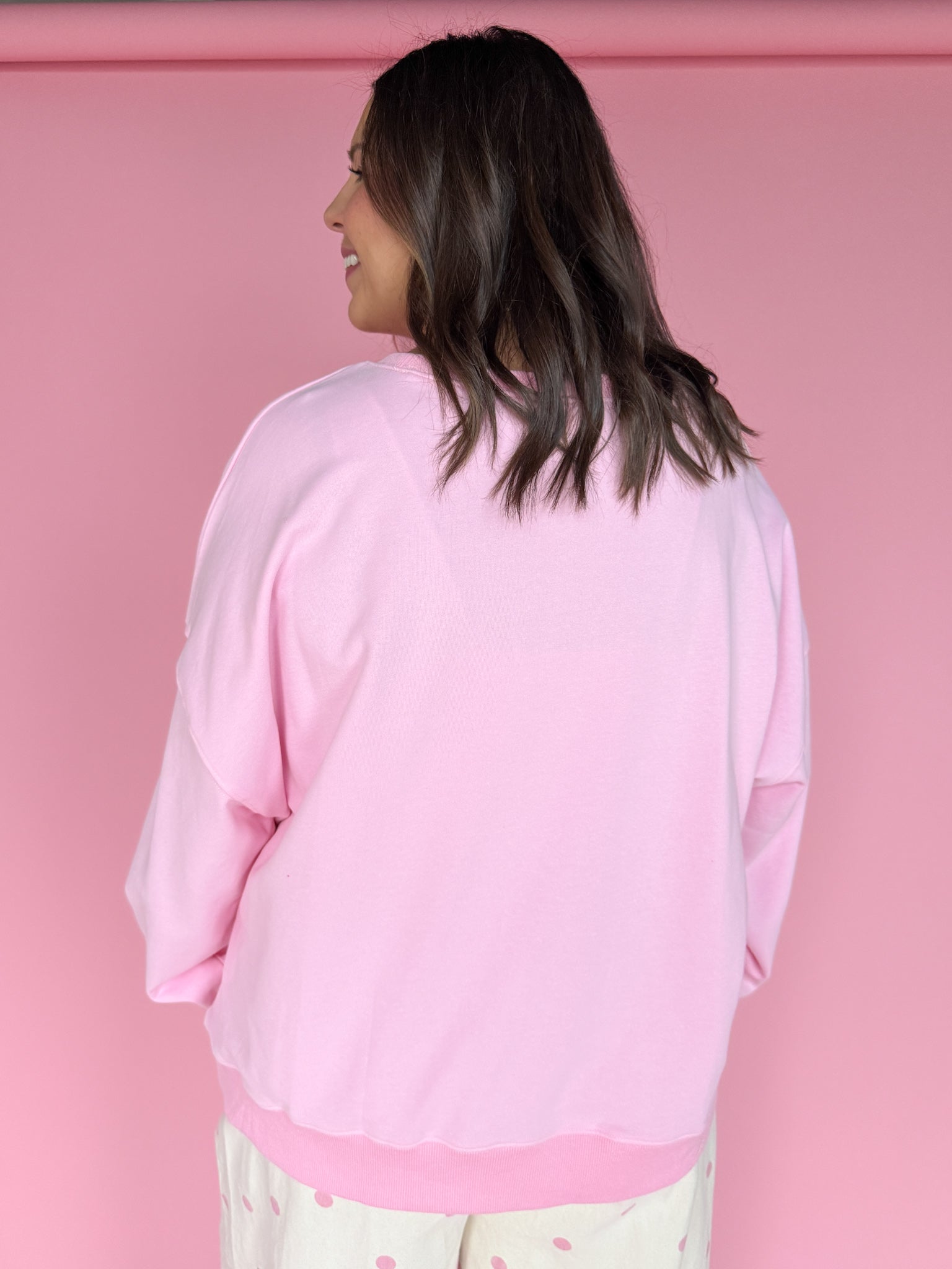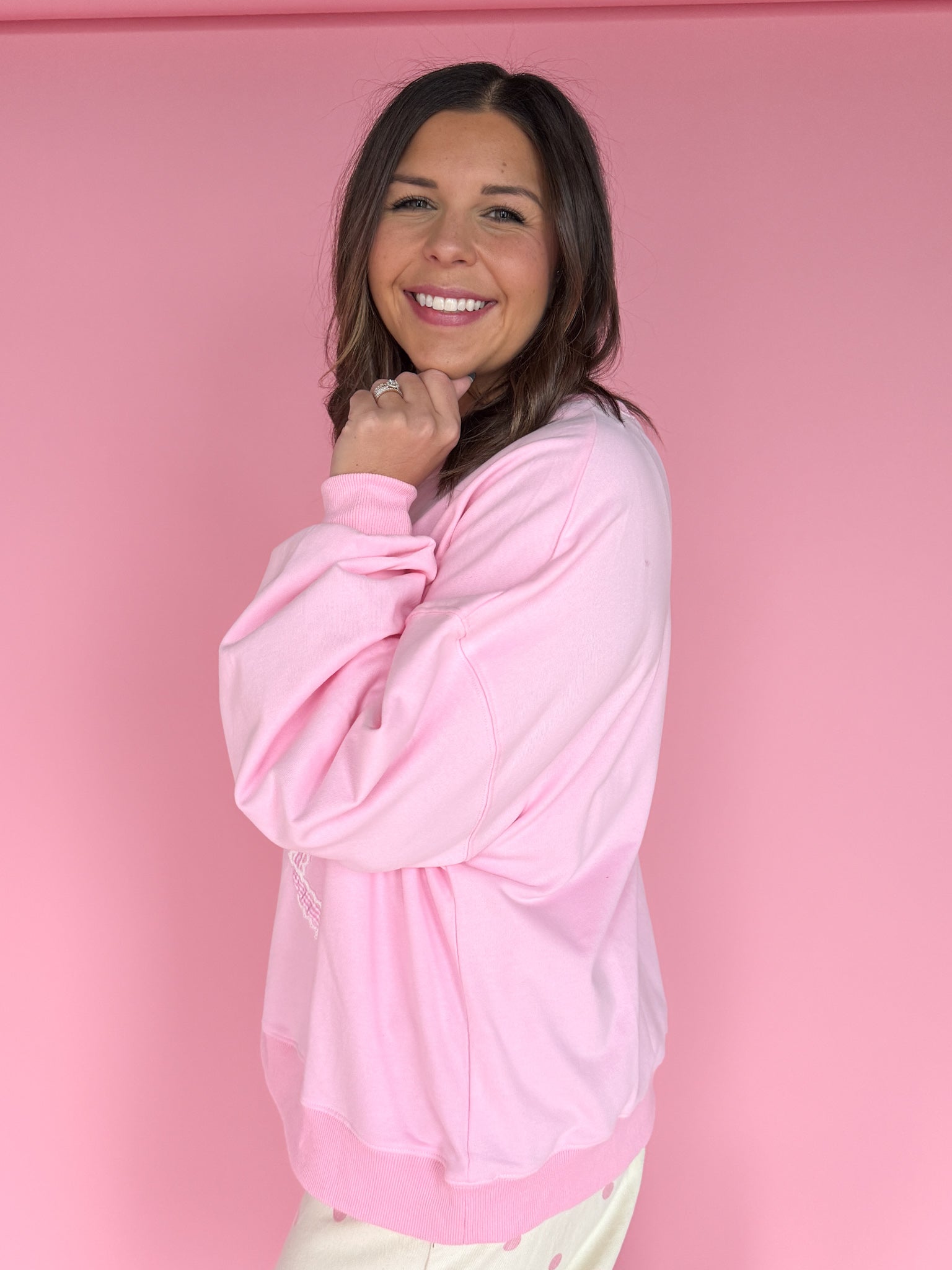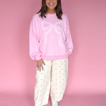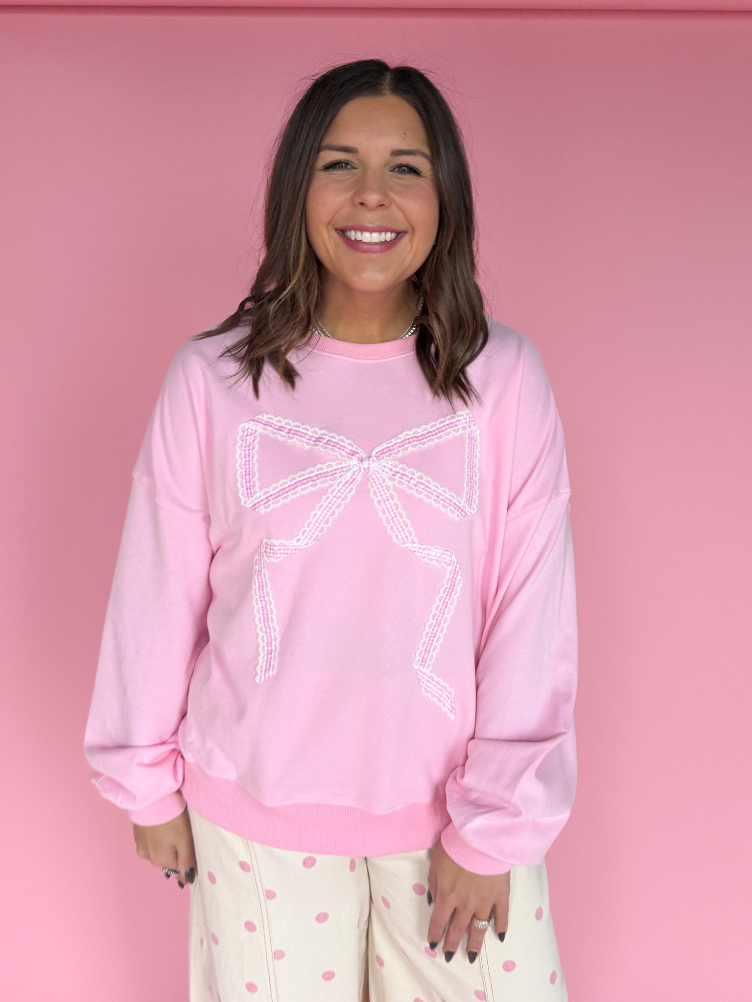Soft, lightweight, and effortlessly feminine—this pink pullover is cozy enough for everyday wear but made special with a delicate lace bow detail. Perfect for adding a touch of charm to your casual look without sacrificing comfort.