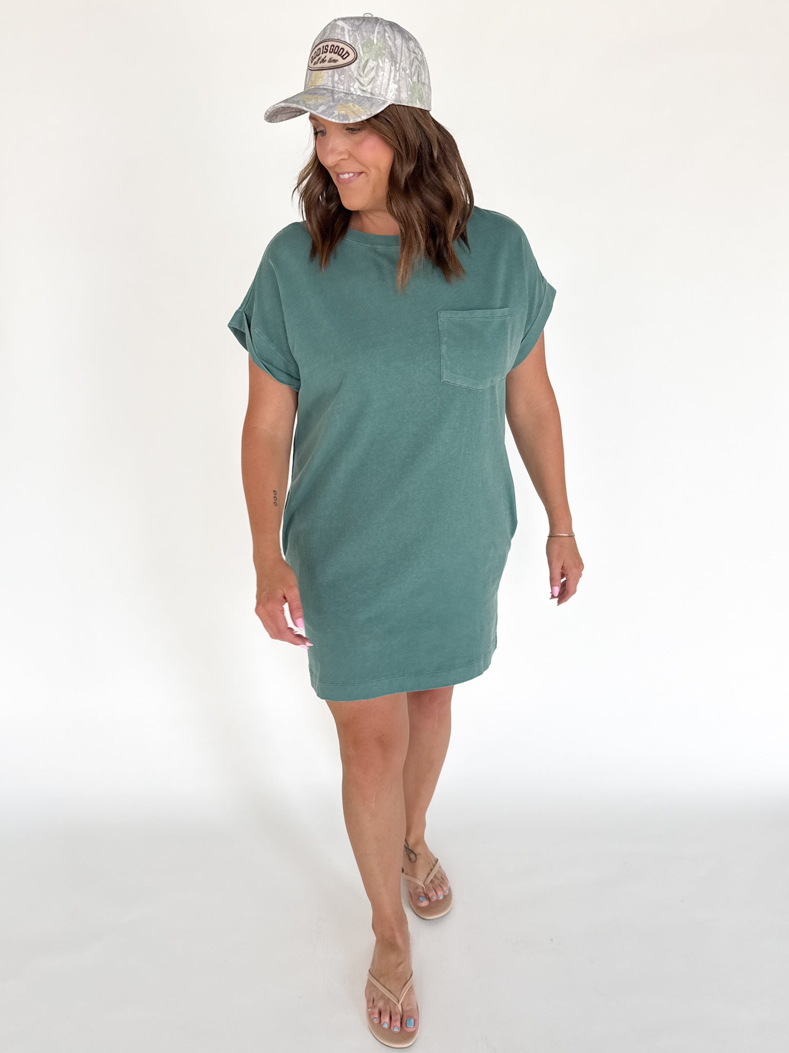 This relaxed mini t-shirt dress is the definition of easy, everyday comfort. Designed with cuffed short sleeves, a classic crew neckline, and a front patch pocket, it’s those little details that make it feel put together without the effort. And yes—side pockets (because we know they matter).